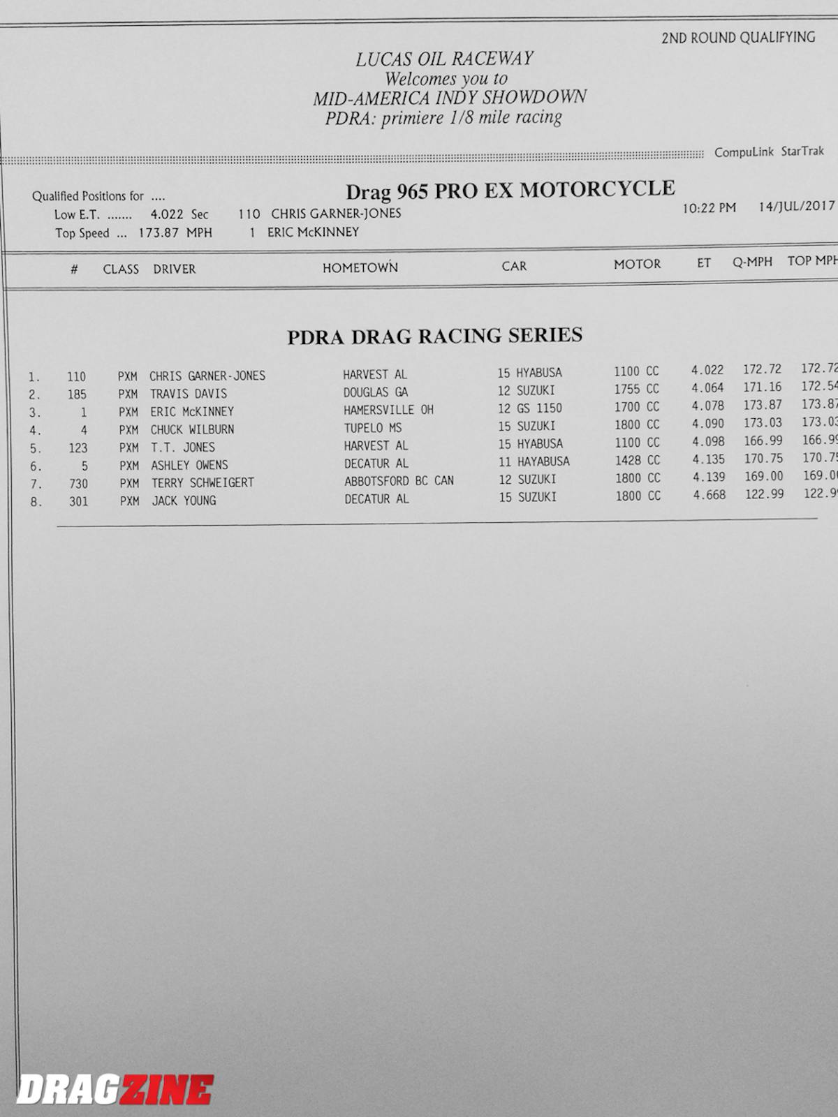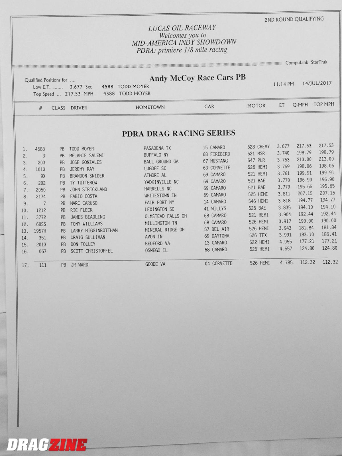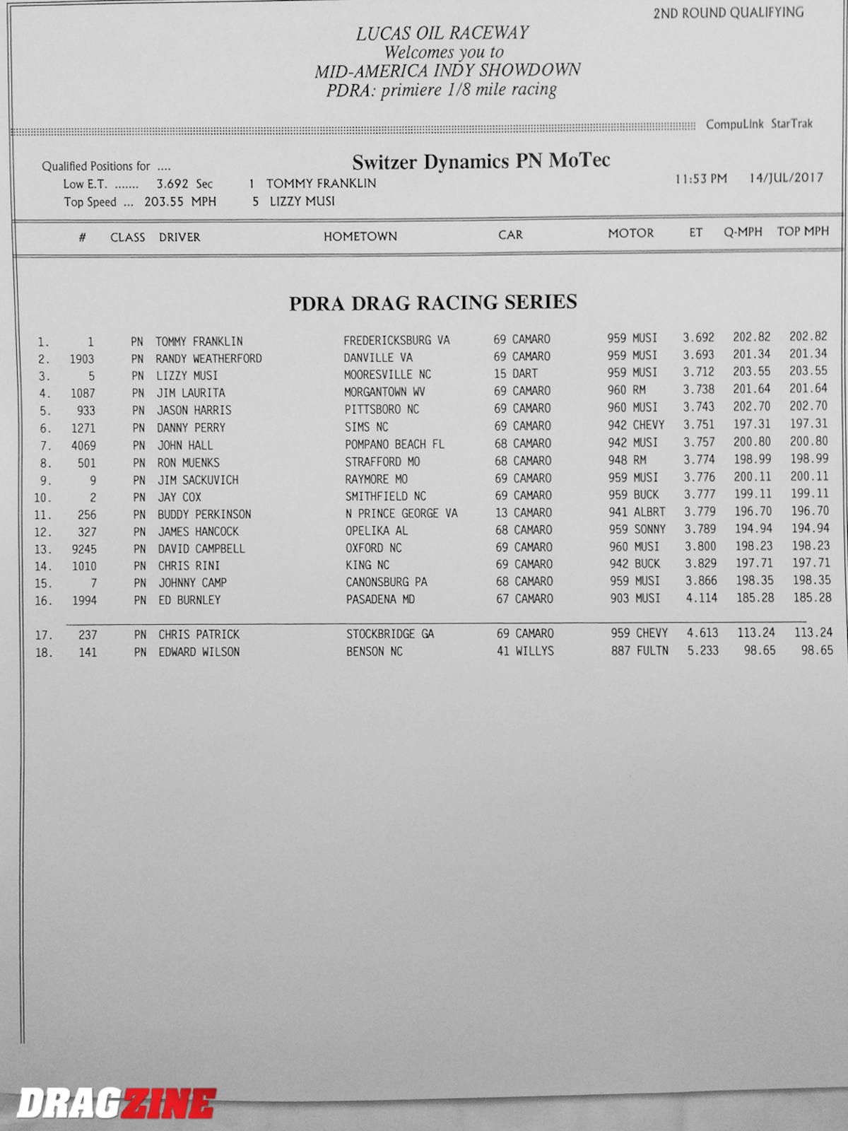 A total of 45 Top Sportsman cars attempted to qualify at the Mid-America Indy Showdown, leading PDRA officials to add a Quick 32 field in addition to the Elite 16 program. The Quick 32 event win went to Jeff Pittman over a red-lighting Gary Wojnowski Jr.