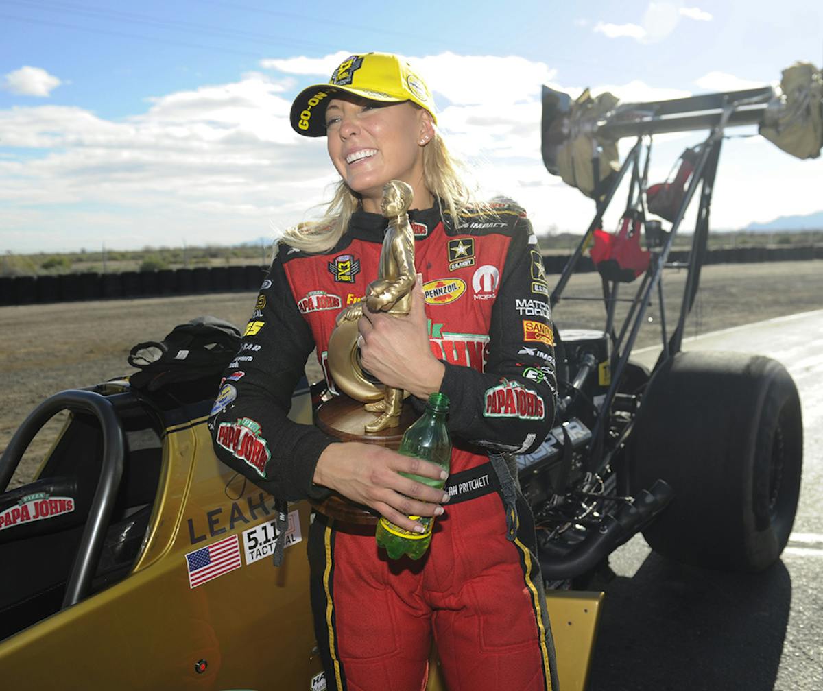 For the second consecutive year Pritchett defeated Brittany Force in the finals. Pritchett’s 3.705-second pass at 328.22 mph in her Papa John’s Pizza dragster earned her the third victory of her career, second of the season and second at the NHRA Arizona Nationals. Force raced to a 3.704 at 330.39 in her Monster Energy dragster losing to Pritchett on a holeshot.