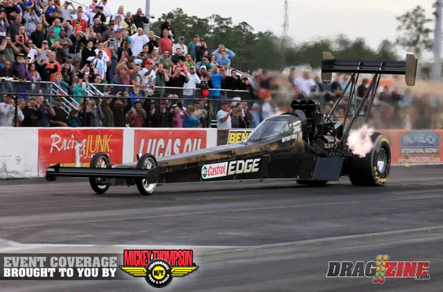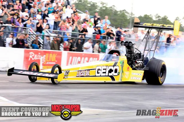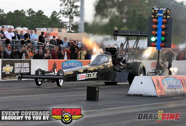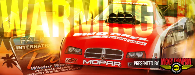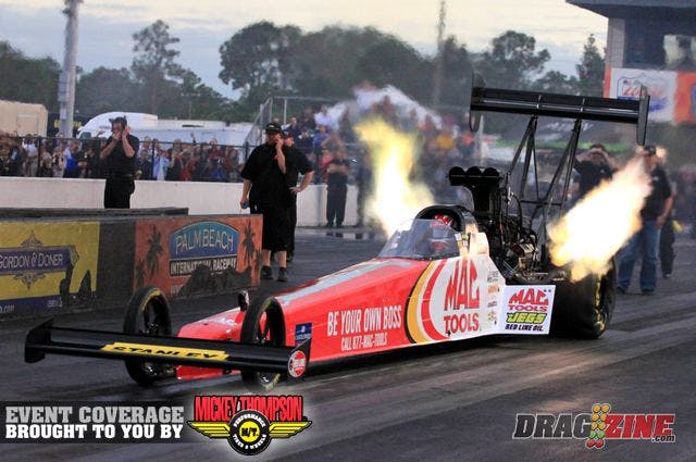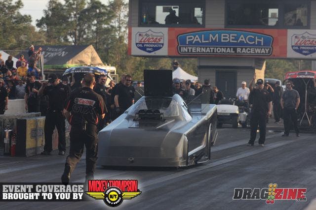 There’s no more fitting a place for the sun to rise on the NHRA drag racing season than in the Sunshine State, where many of the top nitro teams in the Mello Yello Drag Racing Series are tearing up the Palm Beach International Raceway this week as they make preparations for upcoming start to the new season and a run at championship glory. After days of private testing, PBIR will open the gates on Friday and Saturday evening for the public and the media with side-by-side runs under the lights. Dragzine will be on hand bringing you a glimpse at all of the new-look race teams and paint schemes for the new year, so keep it right here for coverage and tons of photos over the next two days.