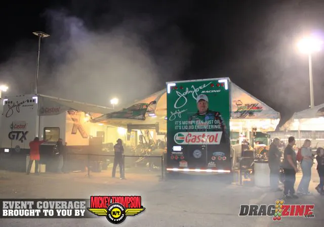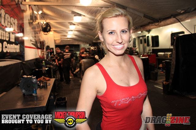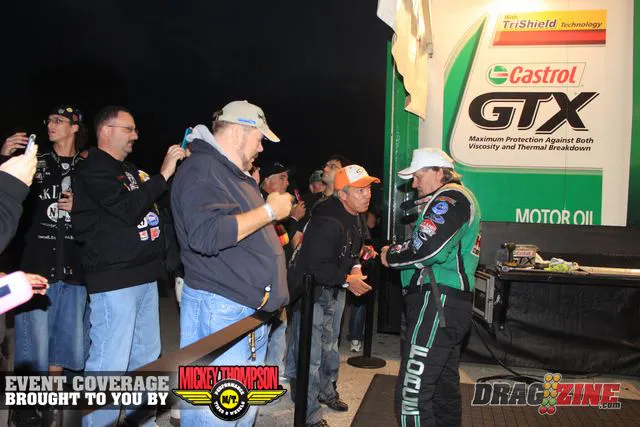 Between session the drivers get to relax, mingle with fans and sigh some autographs. Courtney Force had a good crowd gathered around and was kind enough to stand still for this shot. Her 4.018 @ 322.73 MPH was the best of the night and a new Funny Car track record. We will see Sunday if she, or anyone else can break into the three second zone.