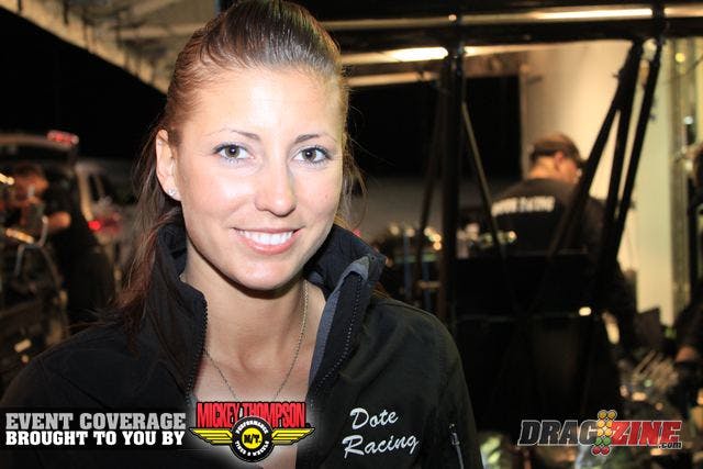 Leah Pruett is another female driver moving up to Top Fuel with Dote Racing. She managed to 3.85's Saturday but lost traction on her final run in the second public session slowing to a 4.279 @ 188.07 MPH. Image/s missing.