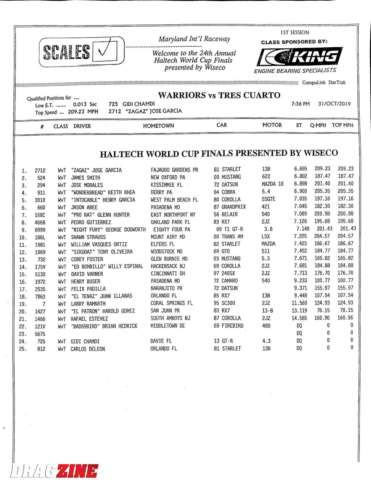 The Warriors vs Tres Cuarto class saw history made by its top qualifier Gidi Chamadi during the third session. Chamadi resent the GT-R world record during the final pass of the day when he lit the boards with a 6.567 at 225 MPH. Keith Rhea’s 6.66 pass puts him in the second spot while Jose Garcia is in third with a 6.95.