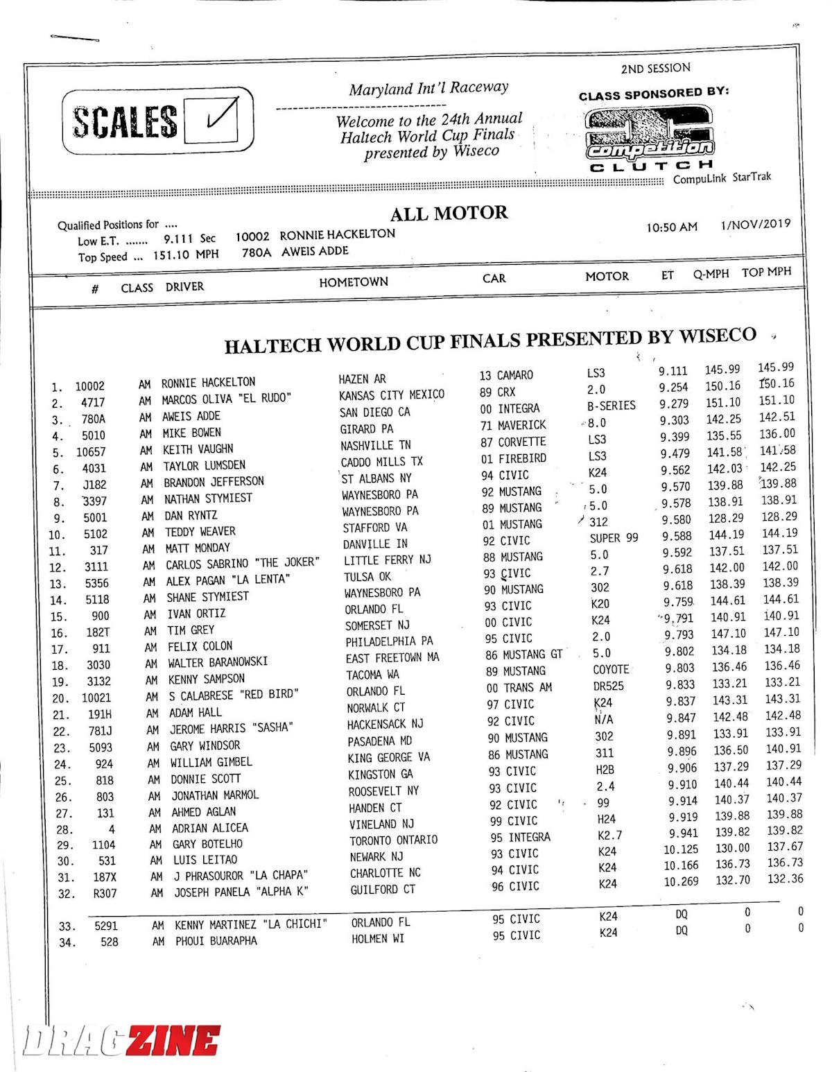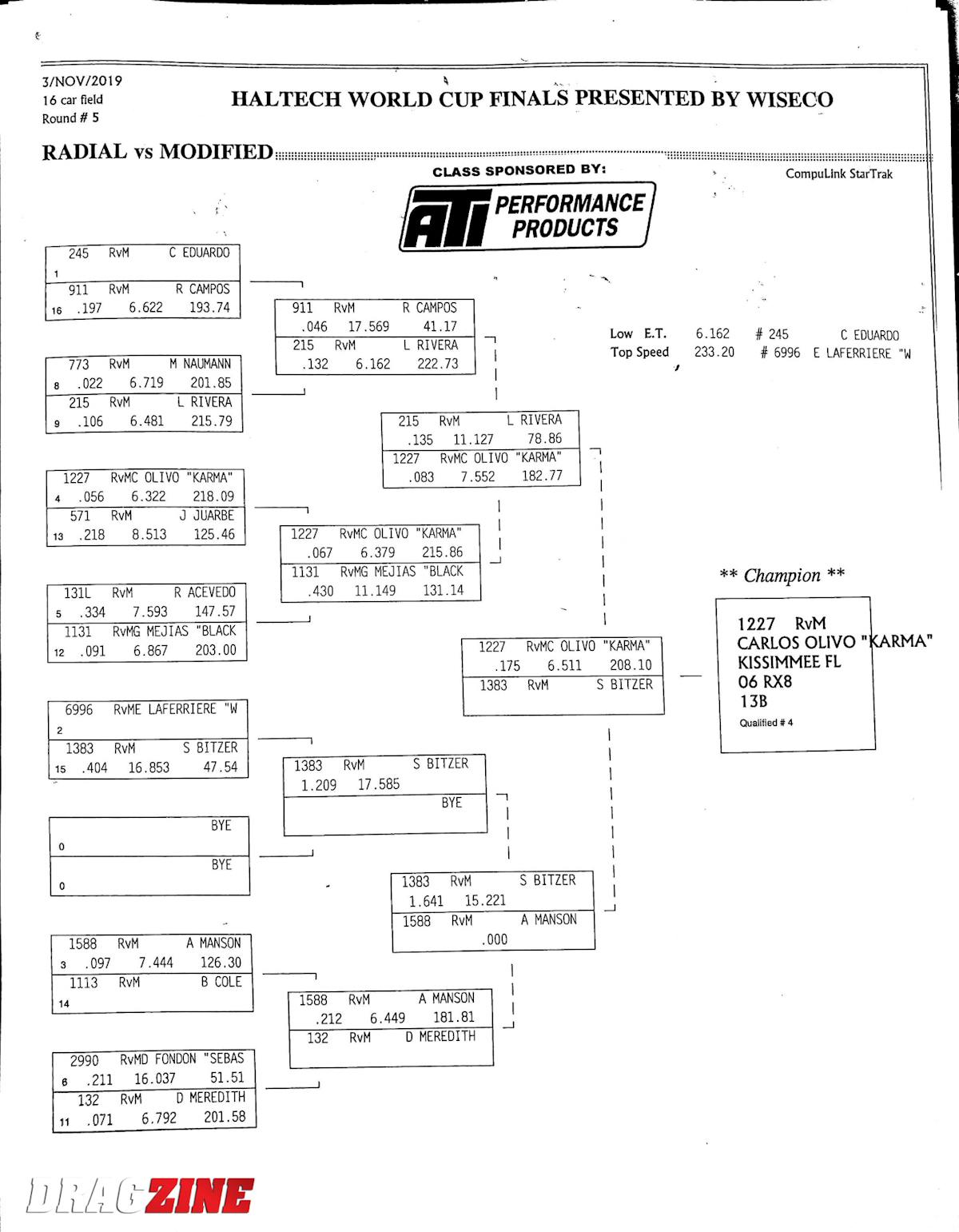 Carlos Olivo fought hard during qualifying to put himself in a good position for eliminations and ended up in the fourth spot when the ladders were set. That hard work paid off, plus he was blessed with some good luck and he was able to make it to the finals against Scott Bitzer who himself got lucky with several byes to the finals. When it was time for the finals Bitzer’s luck ran out as he broke during the burnout giving Olivo the win.