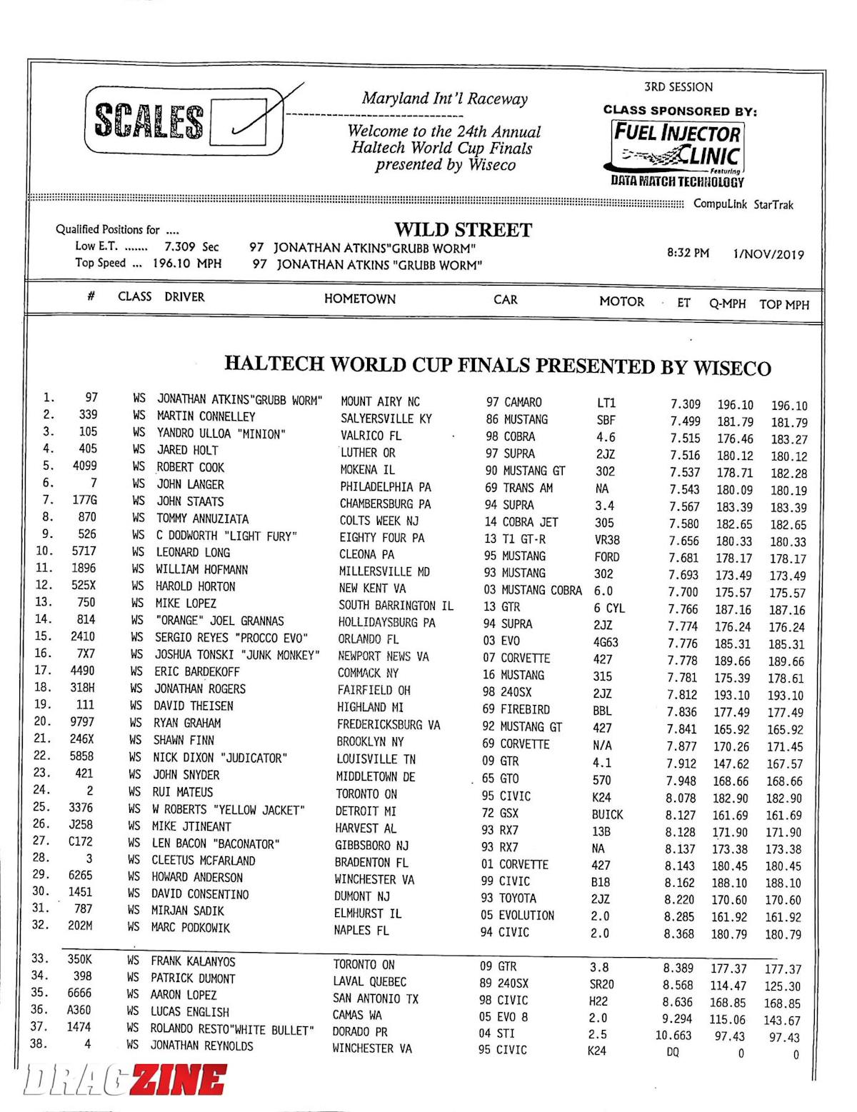 Wild Street saw Jonathan Atkins stay on top with his world-record 7.30 pass at 196 MPH. Martin Connelley was able to pick up a little bit on the final day of qualifying and finished in second with a 7.48 effort. Yandro Ulloa recorded a personal best 7.51 to make a push into the third spot on the Wild Street qualifying sheets.