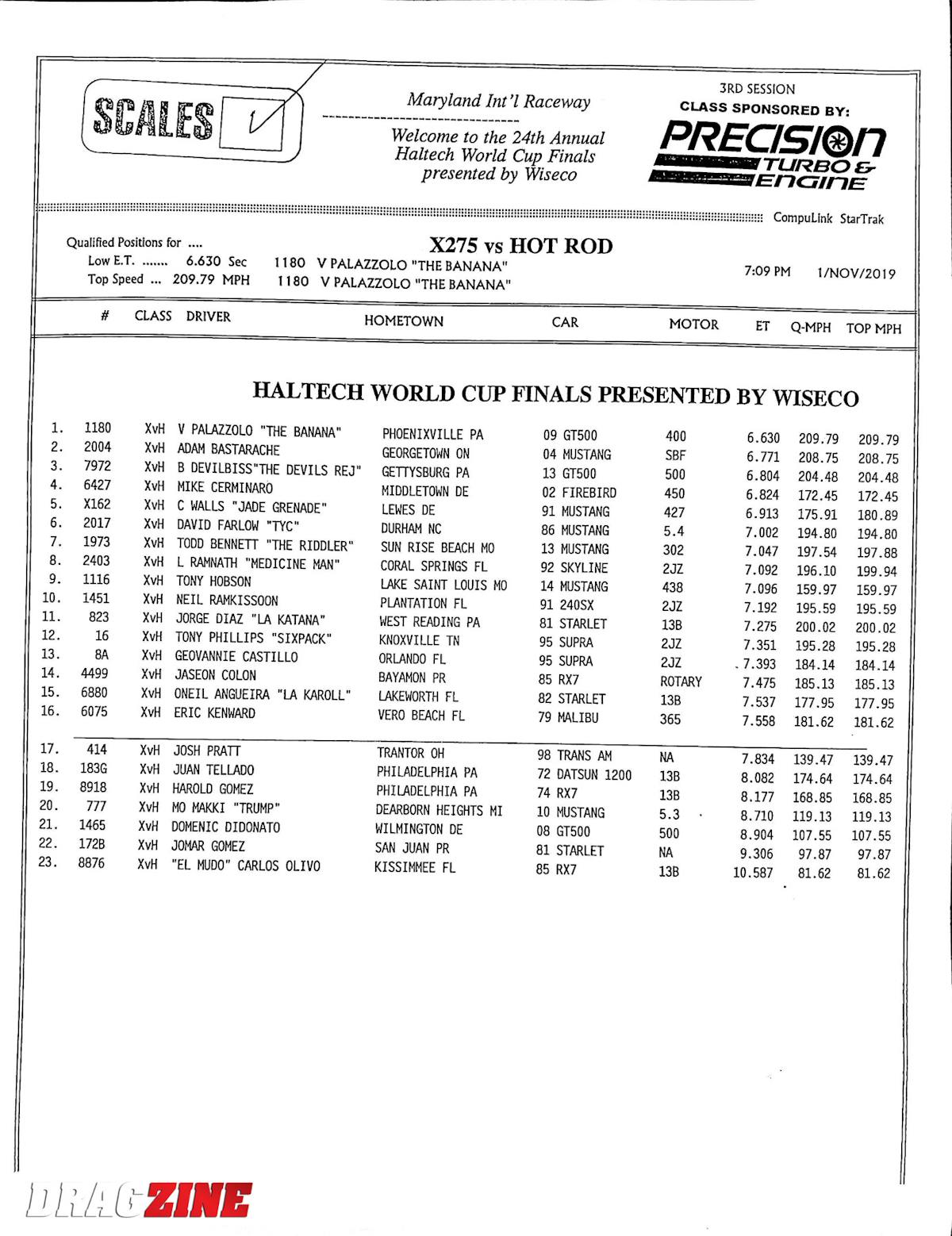 X275 vs Hot Rod was dominated first round by the domestic cars of X275. Former WCF winner Vinny Palazollo led the first round of qualifying with a 6.72 blast at 205 MPH. Adam Bastarache was able to secure the second spot with a 6.92 run while Brian Devilbiss landed in third with a 7.05 hit at 193 MPH.