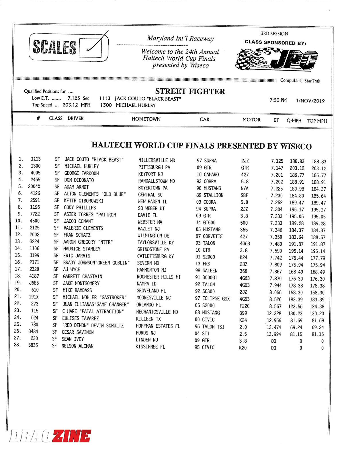 Asier Torres dominated Street Fighter qualifying and was the only racer to crack into the six-second zone with his 6.87 qualifying effort. Jack Couto finished qualifying in the second spot and was the quickest of the seven-second cars with a 7.12 effort. Michael Hurley stayed right on Couto’s heels during qualifying with a best pass of 7.14 after the final session.