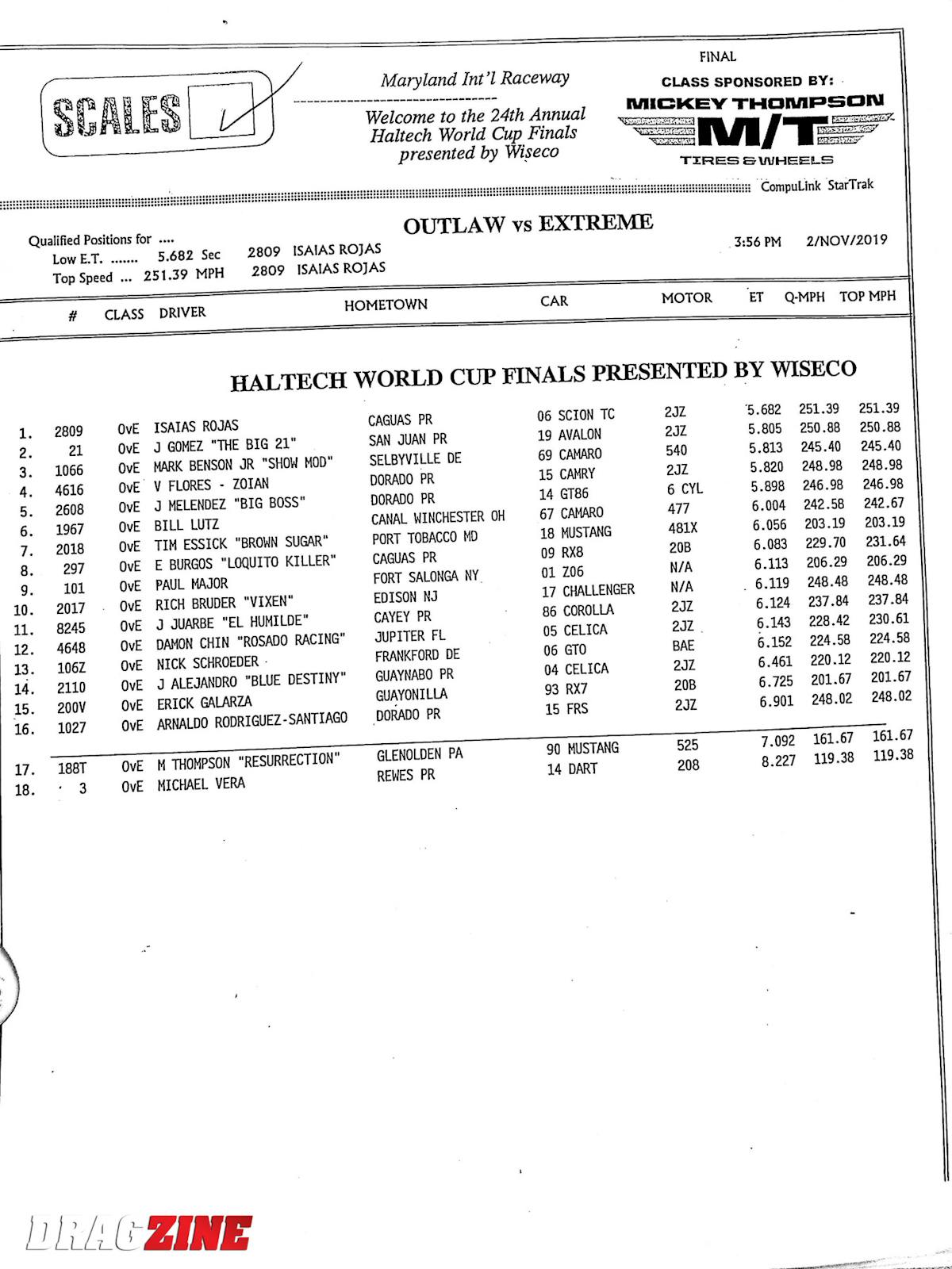 The final session of qualifying were action-packed as racers were trying to improve their position or just punch their way into any of the competitive classes here at the WCF. Outlaw vs Extreme saw Isaias Rojas remain on top with a 5.68 followed by Juan Gomez and his 5.80 pass. Mark Benson still held down the third spot, but after snapping a crankshaft in half the team wasn’t able to repair the engine and were forced to withdraw from the event.