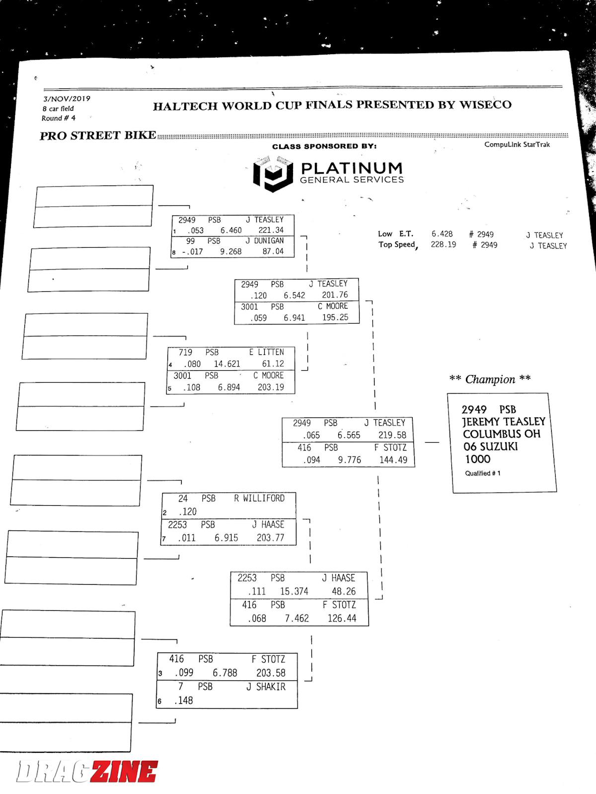 Pro Street Bike saw records broken all weekend long in the near-perfect conditions. Jeremy Teasley locked down the top spot with his 6.42 effort at over 226 MPH. Rodney Willford found his way into the second spot after a 6.50 pass at 219 MPH. After the final session was complete Frankie Stotz locked down third with a 6.58 run at 211 MPH.