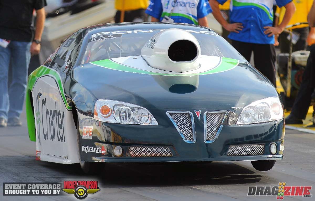 BUDDY ON THE SPOT – The Pro Stock surprise of the weekend was young Buddy Perkinson. He was surprised as much as anyone that he would substitute for Mark Martino — and drive the DeSantis Crane Service Pontiac GXP to the No. 8 starting position and beat veteran V Gaines on a holeshot for his first round-win.