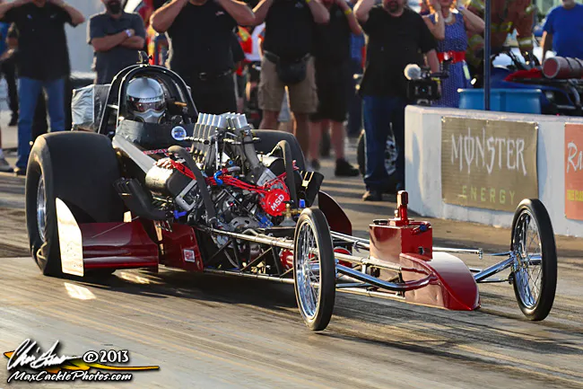 The CSS series is a mid-west group of all blown altereds and front engine dragsters running on an eighth mile, qualifying an eight car field on a 4.25 index then holding an open elapsed time, Chicago-style first round bringing the two quickset winners straight to the final. After two action packed qualifying rounds, Craig Donnelly and the “Booze Brothers” blown 1923 T bodied entry took the pole position with a “perfect” 4.25 at 166 mph. John Umlauf’s blown front engine dragster nabbed the number two spot with a 4.26 at 162 mph and Aaron Leyda rounded out the top three in the Dale Wilkens owned and tuned “Hemi Hunter” with a 4.29 at 156 mph. First time CSS competitor Tera Wendland claimed the final qualifying position in her Texas based blown front engine dragster with a 4.50 at 157 mph as she became the first female to compete and qualify with the CSS series as eliminations were soon to follow.