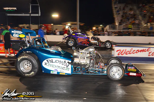 Saturday’s action started shortly before noon with time trials and elimination rounds for the bracket classes which attracted some beautiful machines to the starting line including the “McLaughlin & Holmes” tribute gasser. The call went out in mid-afternoon to start the two qualifying rounds for the Central States Superchargers and Southwest Junior Fuel teams.