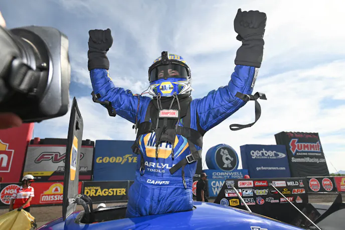 Few wins in Capps’ long career have been as dramatic as Sunday’s. Driving the NAPA Auto Parts Toyota GR Supra, the three-time Funny Car champion survived a massive engine explosion earlier in eliminations before storming back to defeat Spencer Hyde in the final round. Capps ran 4.124 seconds at 303.24 mph to secure his 78th career victory and his fourth win in Phoenix.