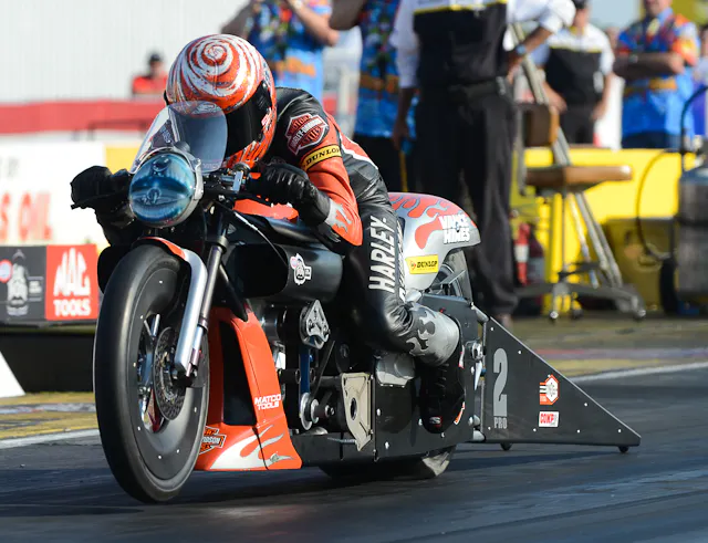In Pro Stock Motorcycle, Hines took the top spot with a stellar run in the final qualifying session. Hines powered his Screamin’ Eagle Vance & Hines Harley-Davidson to a 6.909 at 193.90 to get his first No. 1 qualifier of the season, 29th of his career, and second at Lucas Oil Raceway.