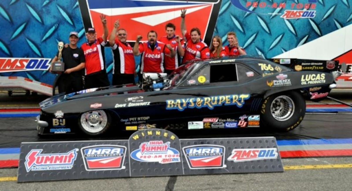Rupert won a race for the ages in the finals of IHRA’s nostalgia Nitro Funny Car class, as the driver of the Bays & Rupert “Black Plague” ’69 Camaro bested three-time IHRA Nitro Funny Car champion Peter Gallen by four thousandths of a second at the line. Rupert joined Kansas native Brad Waddle, winner of Mountain Motor Pro Stock, in the winner’s circle, along with pro winners Mike Scott (Nitro Harley), Ron Maroney (Nitro Altered) and Marisha Falk (Jet Dragster).