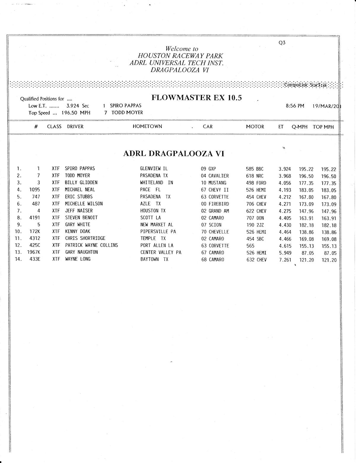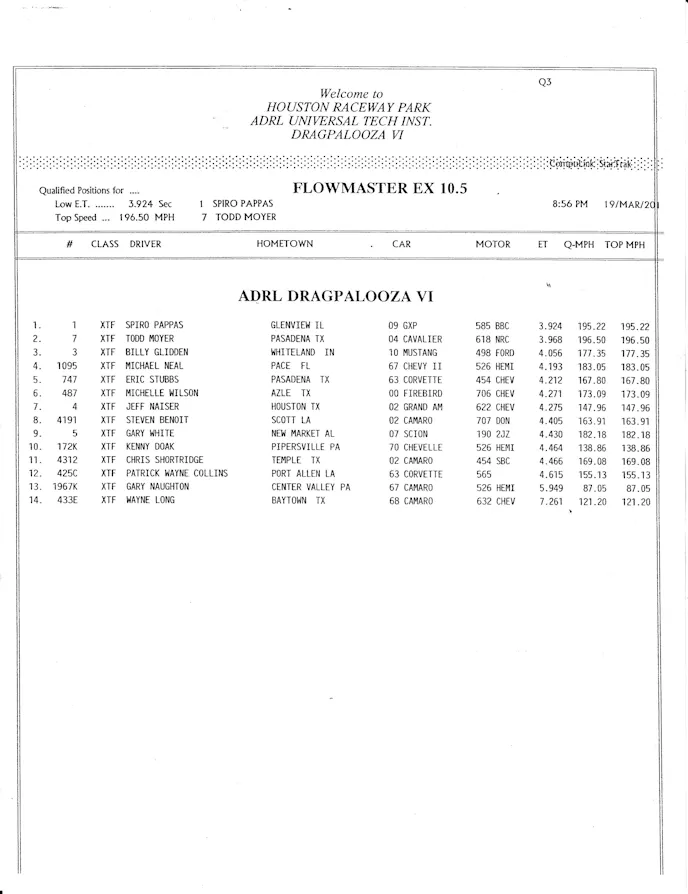 In the Flowmaster Extreme 10.5 catagory the big stiry of the day was Turbo Todd Moyer of Pasadena, Texas. Moyer became the third member of the Mickey Thompson Tires 3 second club running a 3.968 @ 195.22. Spiro Pappas is still on point from his first run of the day. Pappas couldn't get hooked up in the 2 succeeding attempts. There are only 14 entries in the event and number 14 is held by local racer Wayne Long at 7.261 @ 121.20mph.
