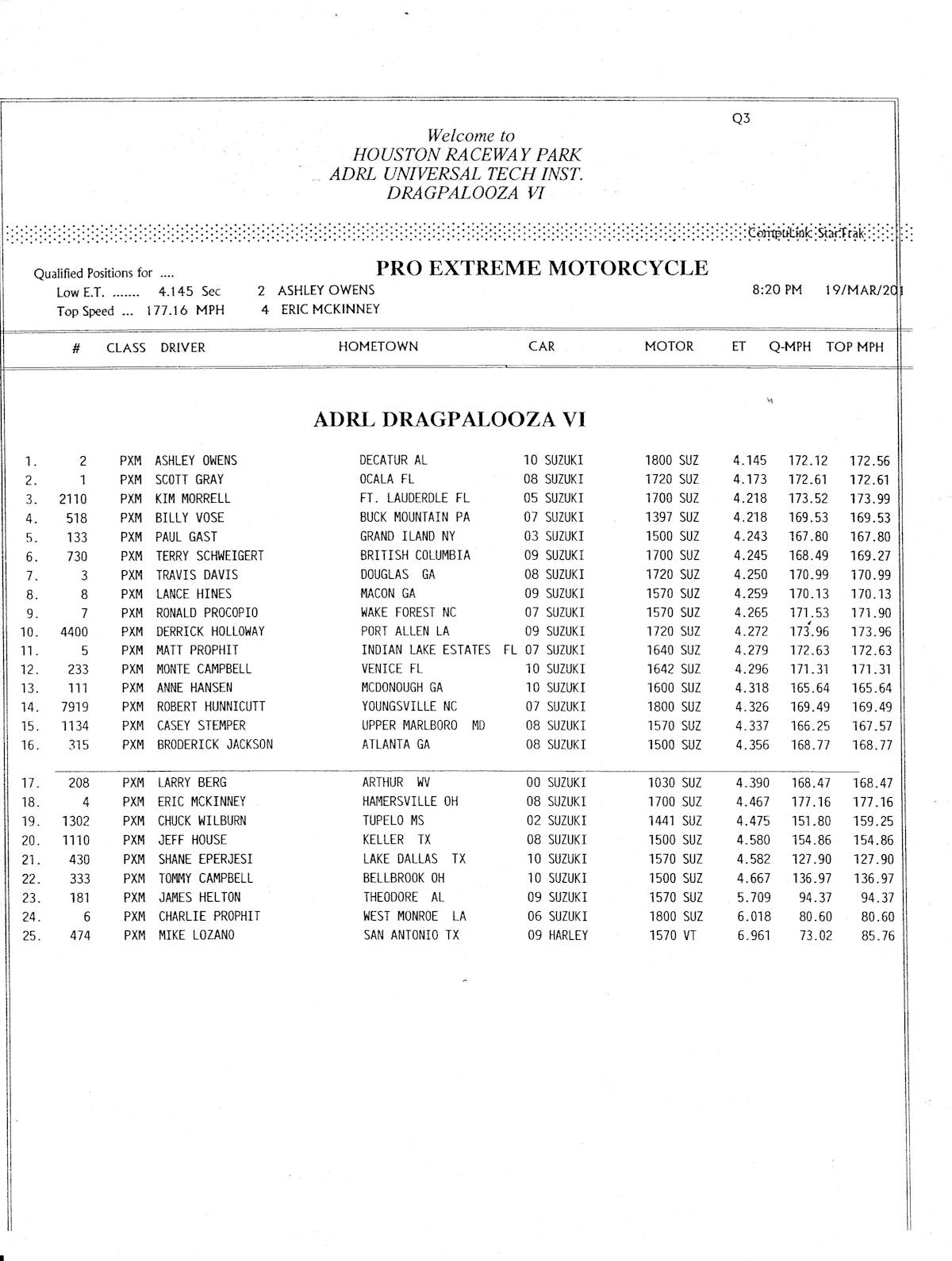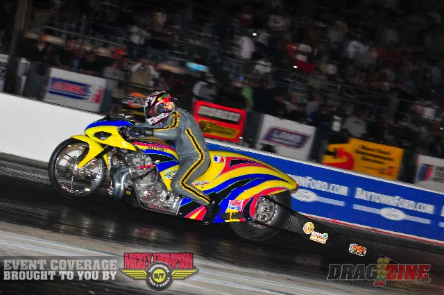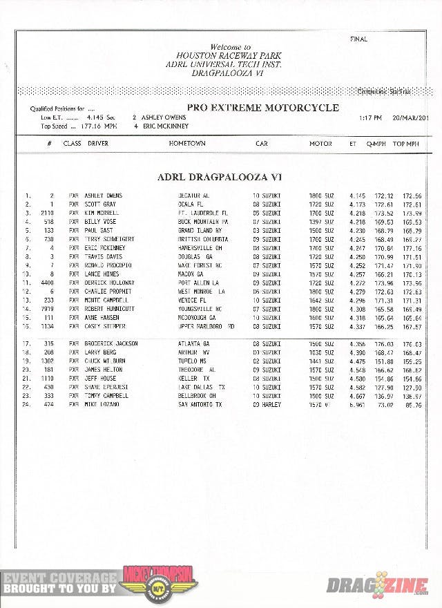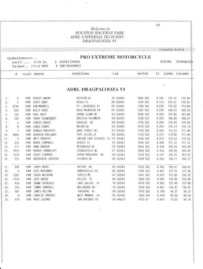 In Pro Extreme Motorcycle Derrick Holloway, above is slotted in at number 10. The class is lead by Ashley Owens with a new world record ET of 4.145. Defending Belt Champion Scott Gray is close behind in second with a 4.173 @172.61mph.