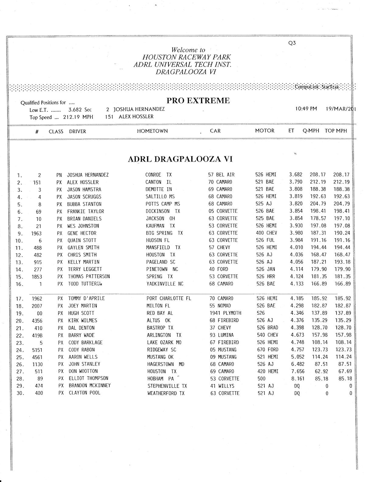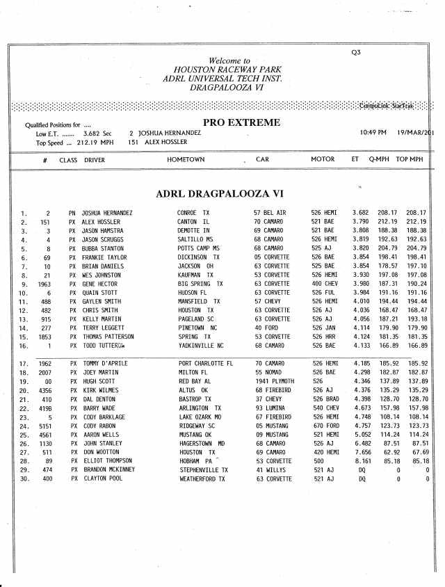 Josh Hernandez is slotted number 1 on qualifying sheet with a stout 3.682 @ 208.17mph.