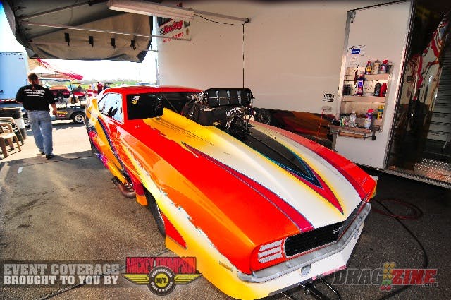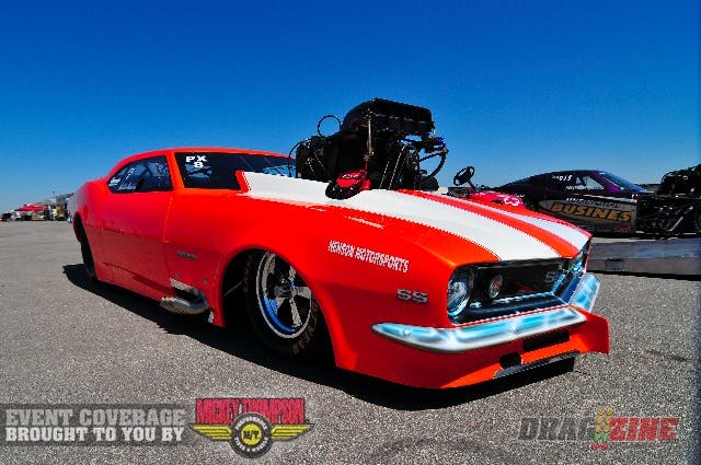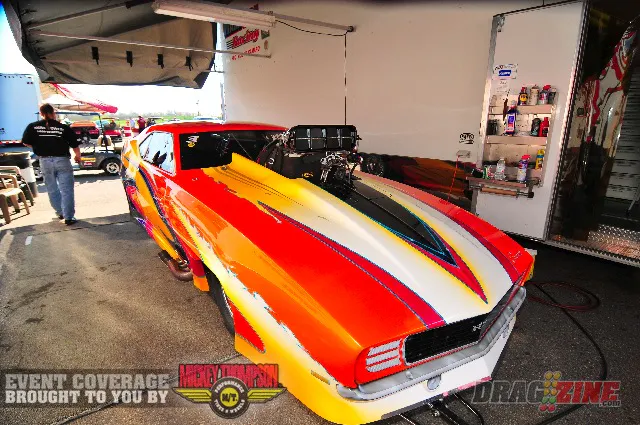 Dan Stevenson's 70 Camaro blew the tranny in the last run last evening. They have anew installed and ready to hit it again and see if he can improved on his 14th spot at 4.24 @149.98mph.