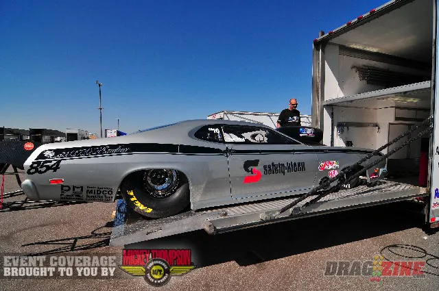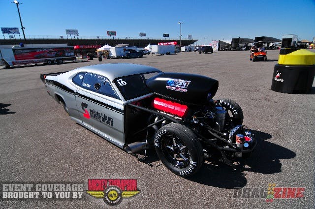 Thomas "Slick" Meyers unveiled his new 70 Duster Pro Nitrous entry today. The Andy McCoy Race Cars built piece has yet to turn a tire on the track. Meyers is anxious to get it fired up and light them up. It's different seeing a silver car in this pit instead of red but it is one looker.