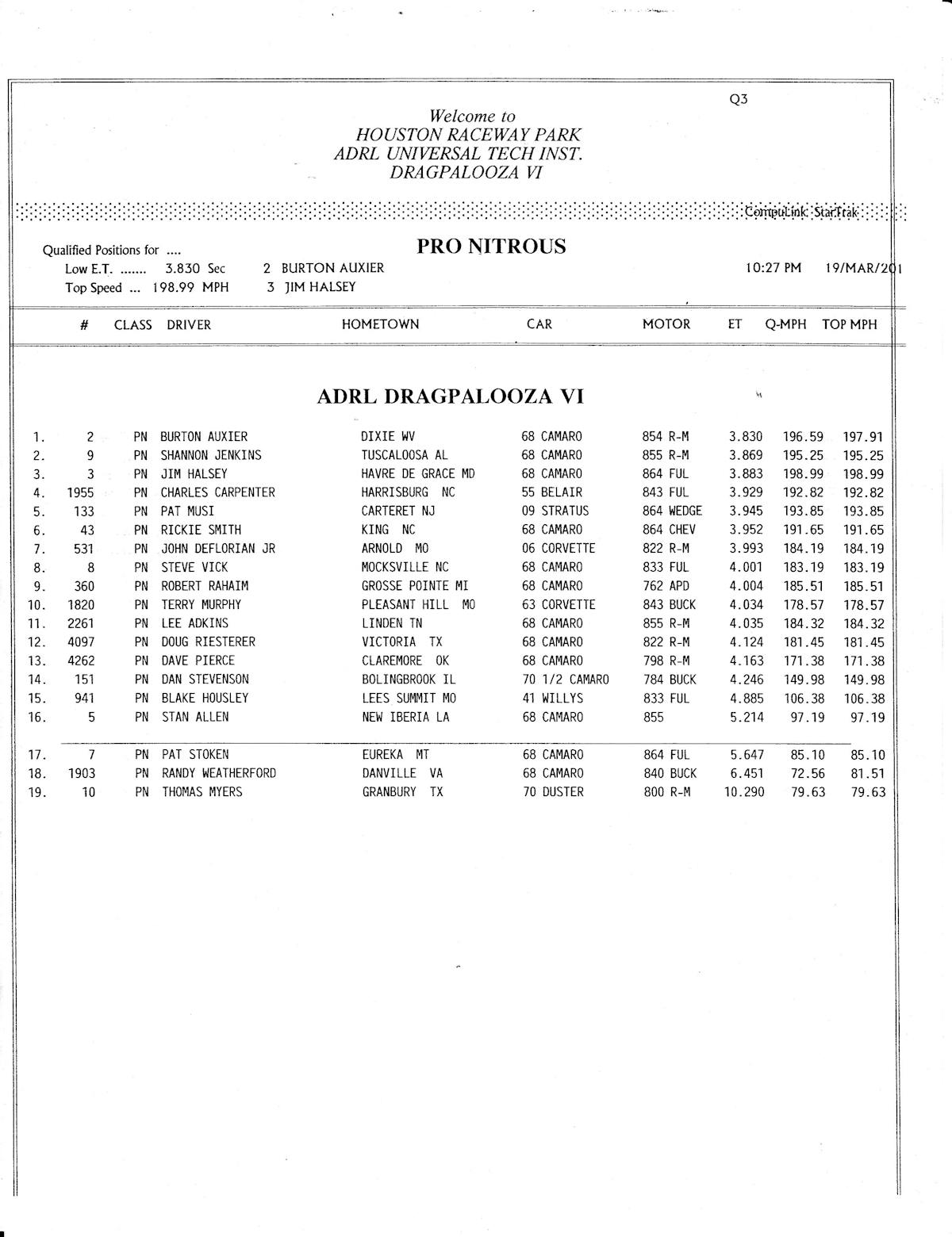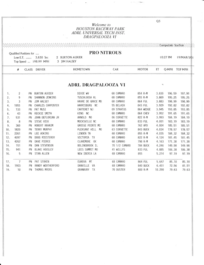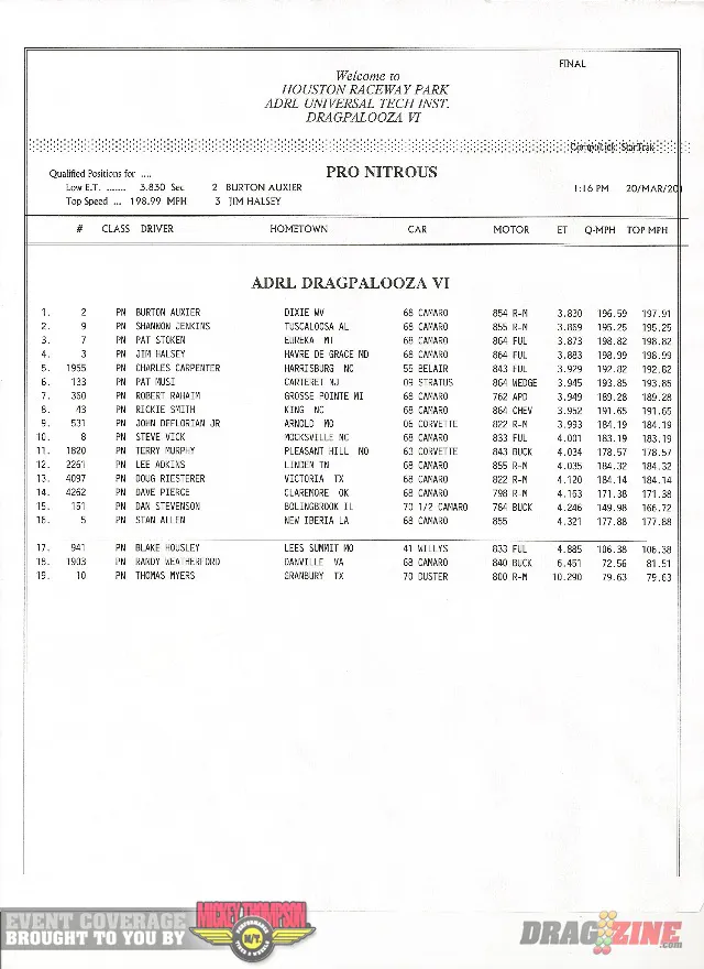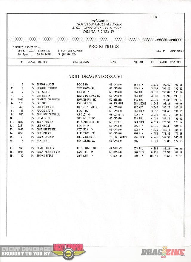In Pro Nitrous Burton Auxier came out in round one and set the front end of national speed mark with a fine 3.83 @197.91mph.