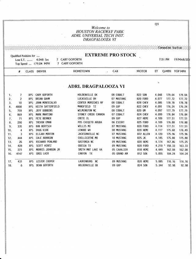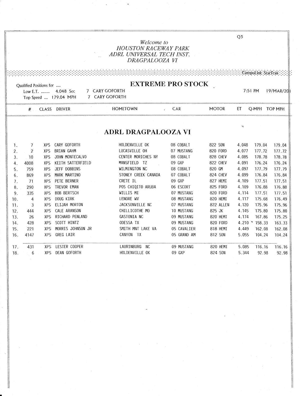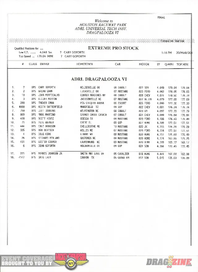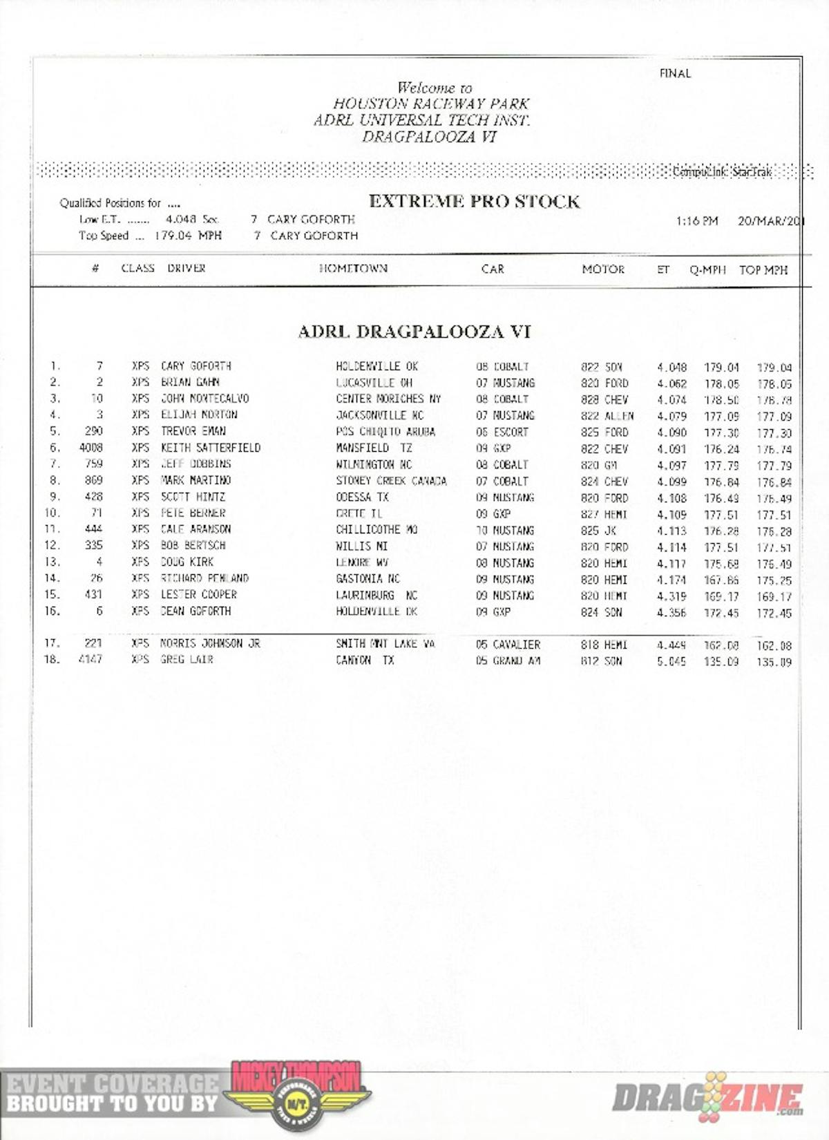 Extreme Pro Stock racer Dean Gororth made the field on his last attempt with a 4.356 @ 172.45. is son Carey is at the other end of the spectrum with his world record qualifying effort that rest both ET and speed with a 4.048 @ 179.04. Cary was more concerned this morning about his dad getting in than running the required back up for the ET mark and he got both wishes fulfilled.