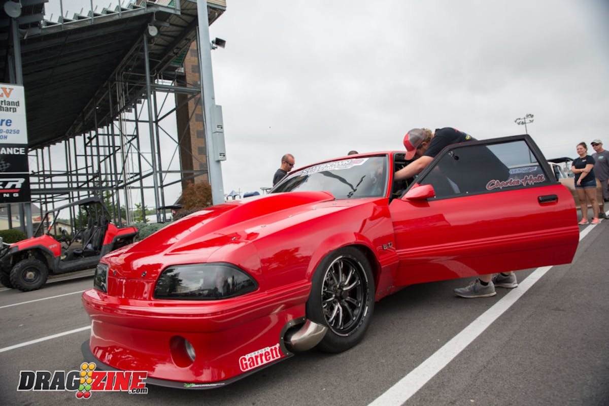 The sun is out, the lanes are full, and there is racing on the track here at the Shakedown At The Summit. The weather is going to be hot again today and all of the teams are getting a game plan ready for the conditions.NMRA Street Outlaw star Charlie Cooper bolted up a set of 315 Micky Thompson drag radials to his Mustang to run the Heavy Street class. So far it has paid off since Cooper earned the top qualifier spot coming into Sunday’s eliminations. Cooper told us the gear ratio isn’t optimal but it’s working and they are ready to go some rounds today.