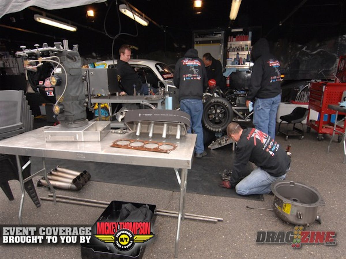 Jason Enos' crew readies for battle this morning. Enos is pitted next to Tim Lynch. Expect the pair of twin turbo runners to take advantage of today's 1400 feet below conditions and set records in Outlaw 10.5. They will be the third class out today in the rotation.