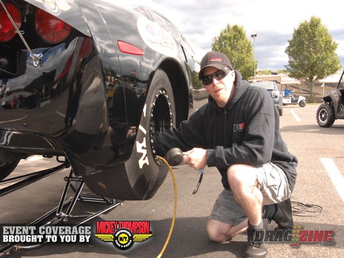 Tim Lynch checks the tire pressure. Lynch wishes for a shot at the track today, but Outlaw 10.5 will get 3 runs Saturday.