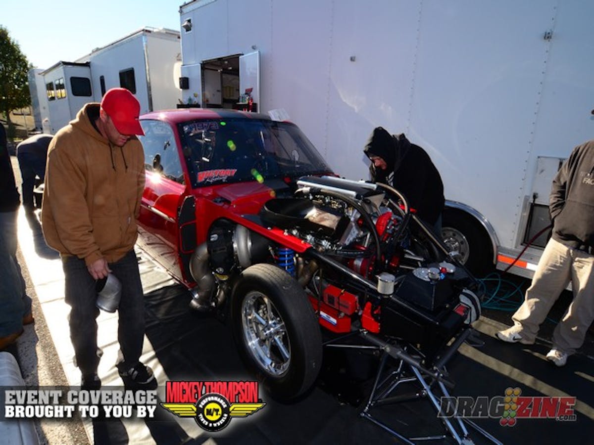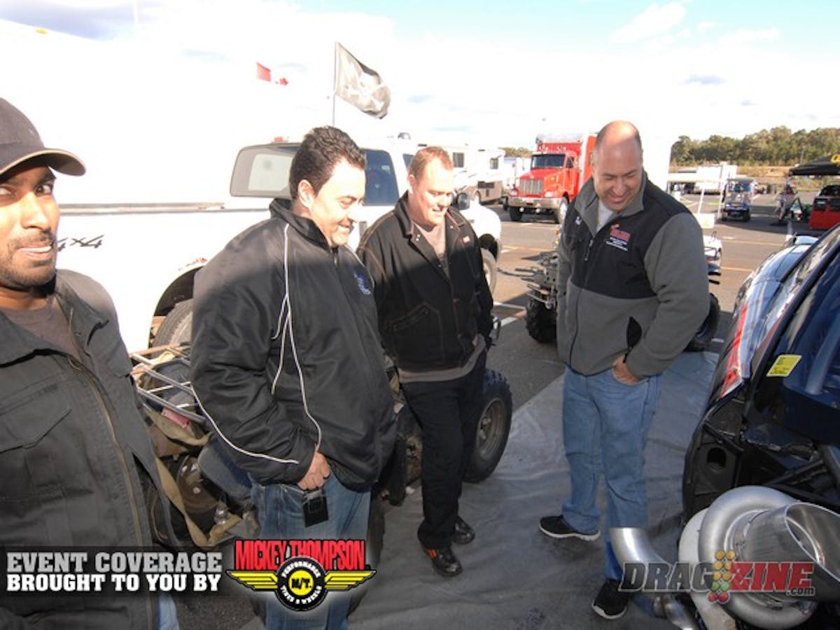 Paul Major on the right is at Shakedown with a new turbo configuration, with the angled. Here he takes time to talk with fellow Shakedown racers. Major was just getting the car to idle this morning in the Etown pits, but is confident that once the combo is sorted out, it will be stout.