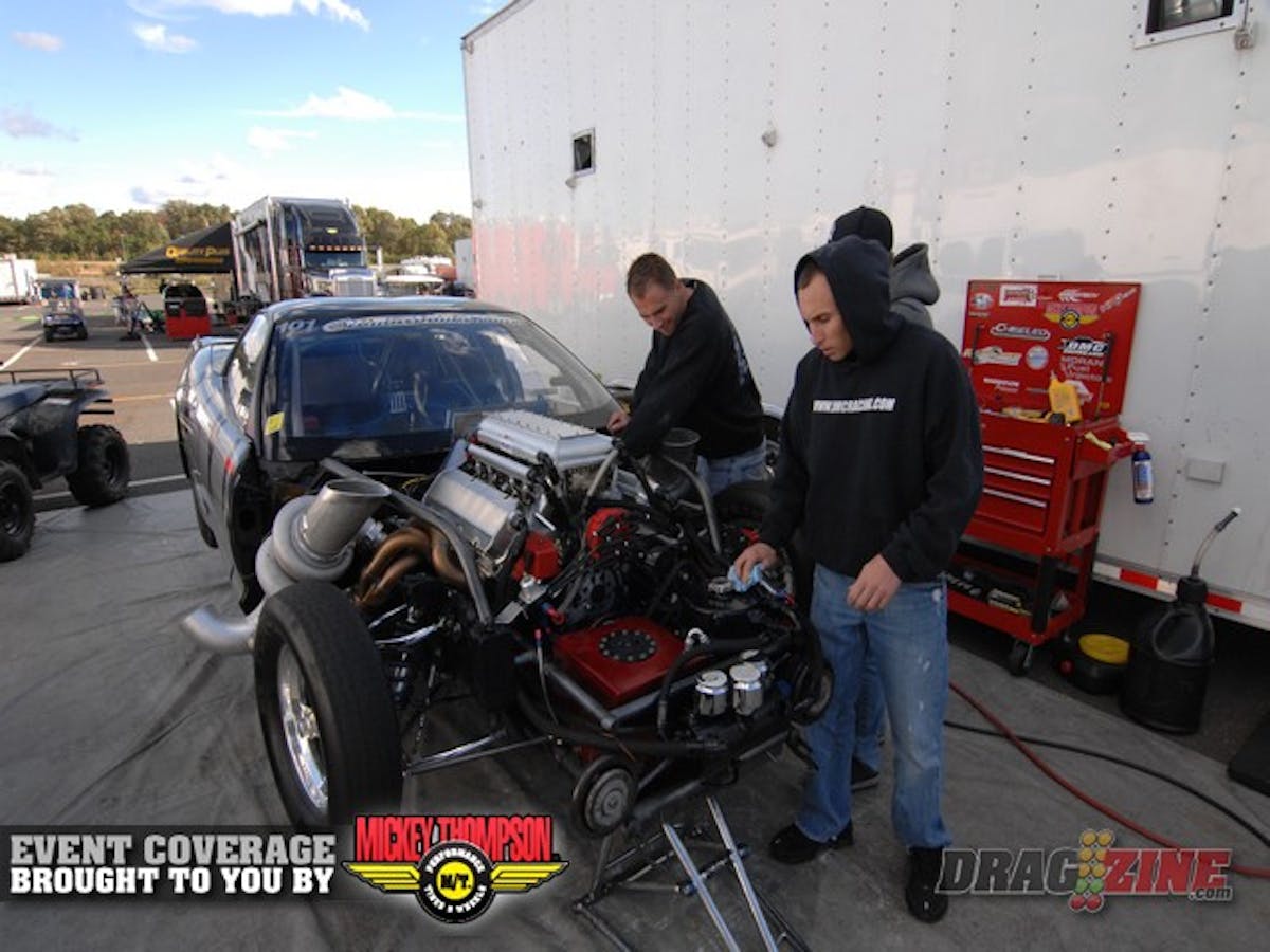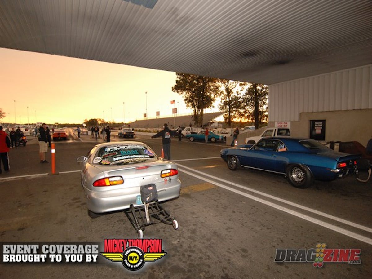 Mike Maggio is in the house at Shakedown as he made the haul to the East Coast. Scott Oksas also has his turbo powered Mustang from the west, splitting gas expenses for the trip. Maggio tested Wednesday and made 5 runs with a best of 5.80/251. Mike has 2 motors, 3 tranny's, a spare set of heads and lots of other spares, so when he puts the steam to the Camaro Saturday, he has the parts if needed to repair the car.