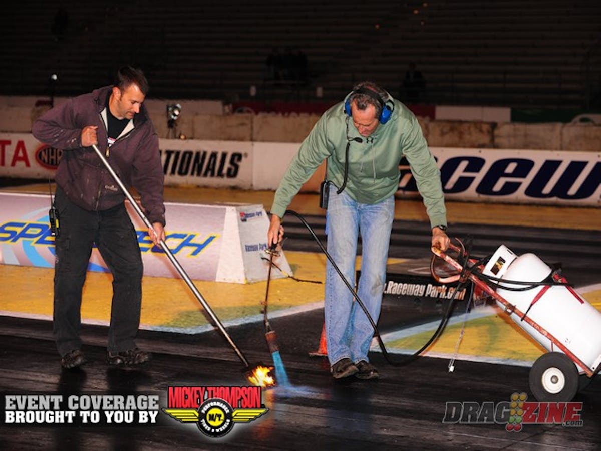 Track manager and NHRA star Eddie Krawiec and starter Alan Brenner clean the track after a leak on the line.