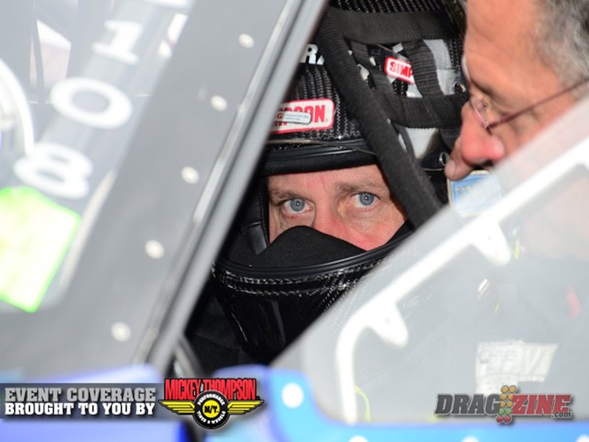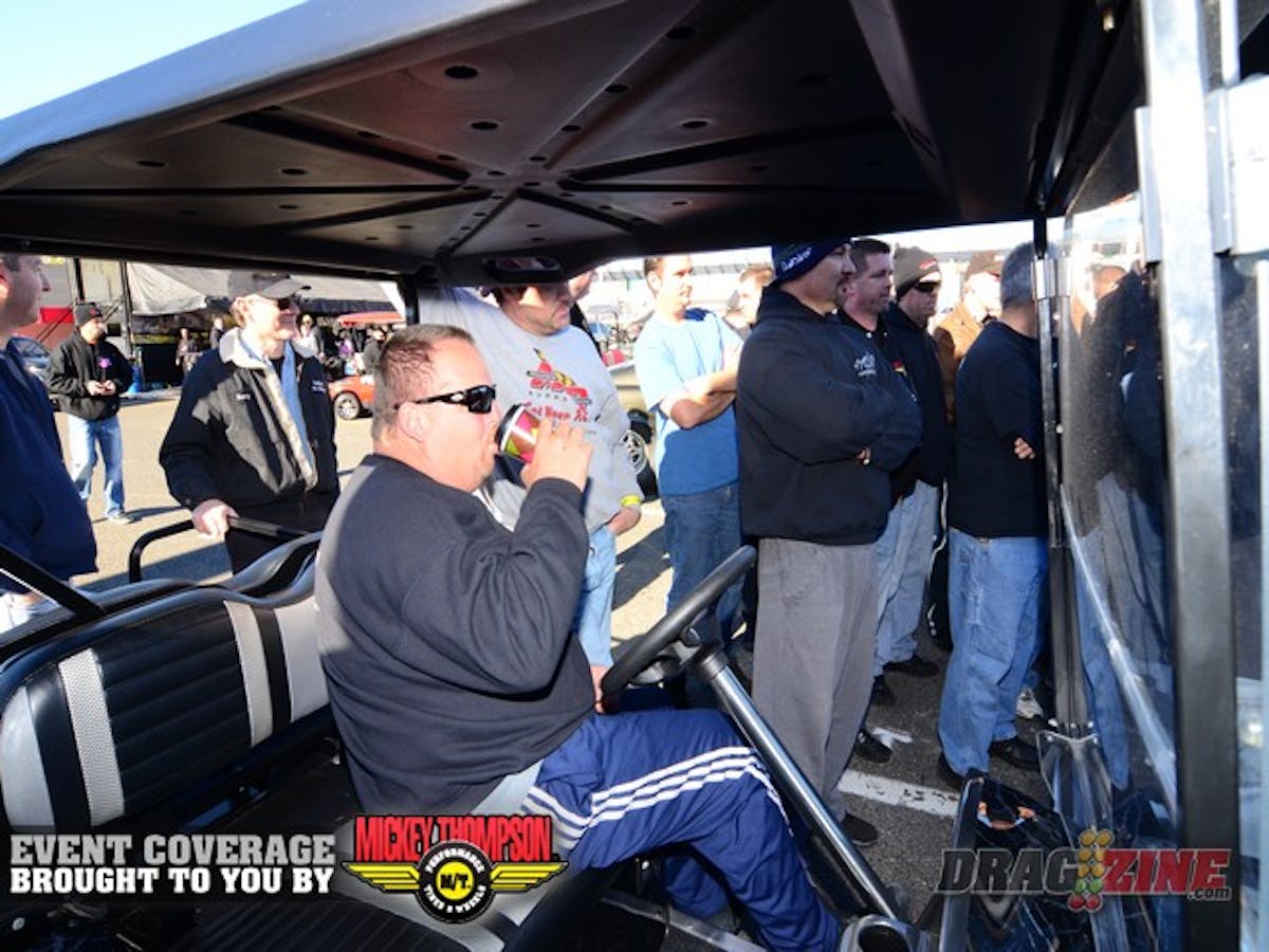 Richard Sexton sips some coffee during the driver meeting. He was testing until yesterday, but had a tough time getting a good run in at MIR. Sexton has been a previous Outlaw 10.5 #1 qualifier at Shakedown.