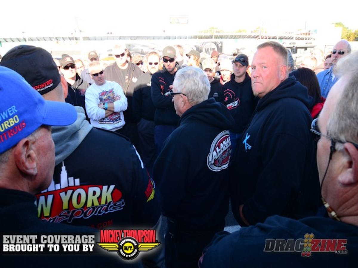 Dave Hance and Bubba Corzine conduct the drivers meeting prior to Saturday morning qualifying sessions. They were going over procedures for the event and class rotation. NHRA Tech is also onsite to conduct chassis certs if needed.