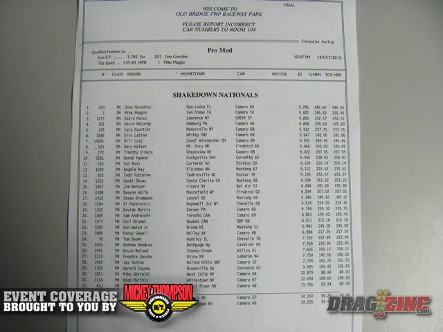 Pro Mod- Eric Latino scored one for the Canadians running 6.0111/243 in the final over a red-lighting Dwayne Wolfe. Wolfe recorded a 6.120/231 for runner up money.Pro Street Bike final- Jeremy Teasley defeated Joey Gladstone with 6.970/212.66. Gladstone was close with a 7.141/211.06 pass.Outlaw 10.5- Rob Wells scored paydirt in Outlaw 10.5 action, outrunning Charlie Dolbin. Wells recorded a winning 4.150/189.20 for the victory.Rich Bruder recorded a 4.660/157 in the semis over an off pace Craig Walls. Bruder scored the X275 title last year and was looking good to do it again.X275- Final round was not run due to running past curfew. Semi-final winners were Sean Ashe in an 85 Mustang and defending champion Rich Bruder in an 88 Mustang.Top Sportsman- Wayne Horton 98 Olds Cutlass won the title over the Dodge Avenger of Alan Prusiensky with a winning 4.662 and a .003 reaction time.Pro Imports were also at Shakedown, although they too split the purse. Here is semi-final action with Jorge Juarbe taking the win and setting low ET/ top speed of the event. The numbers for the 82 Toyota Carolla were 6.505/217.74.One of the most storied race tracks on the East Coast, Old Bridge Township Raceway Park proved once again to be the record-breaking facility it has always been known to be. Shakedown Nationals 10, under the guidance of promoter Dave Hance and Michelle Marchase and Eddie Krawiec of RP and the entire staff gave racers the chance to strut their stuff. Raceway Park gave their best even when facing a computer crisis that fried several computer parts, pieces and scoreboards. A big thanks to RP for not giving up!