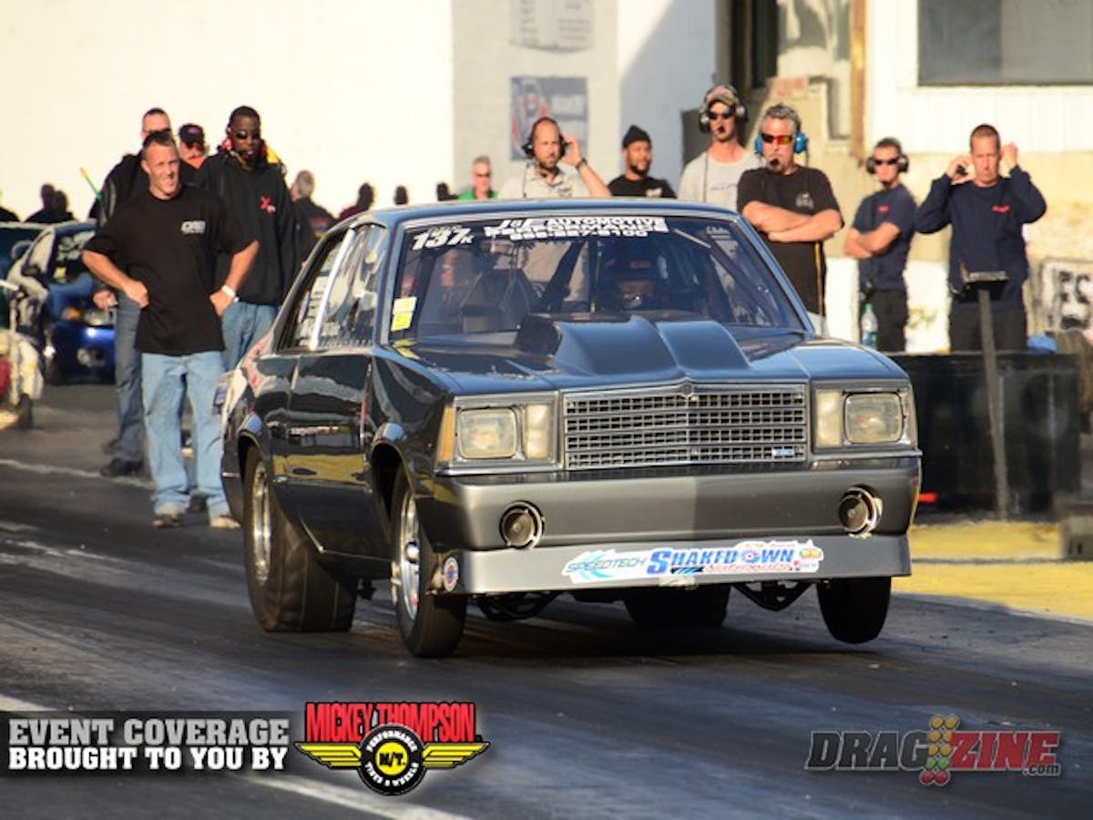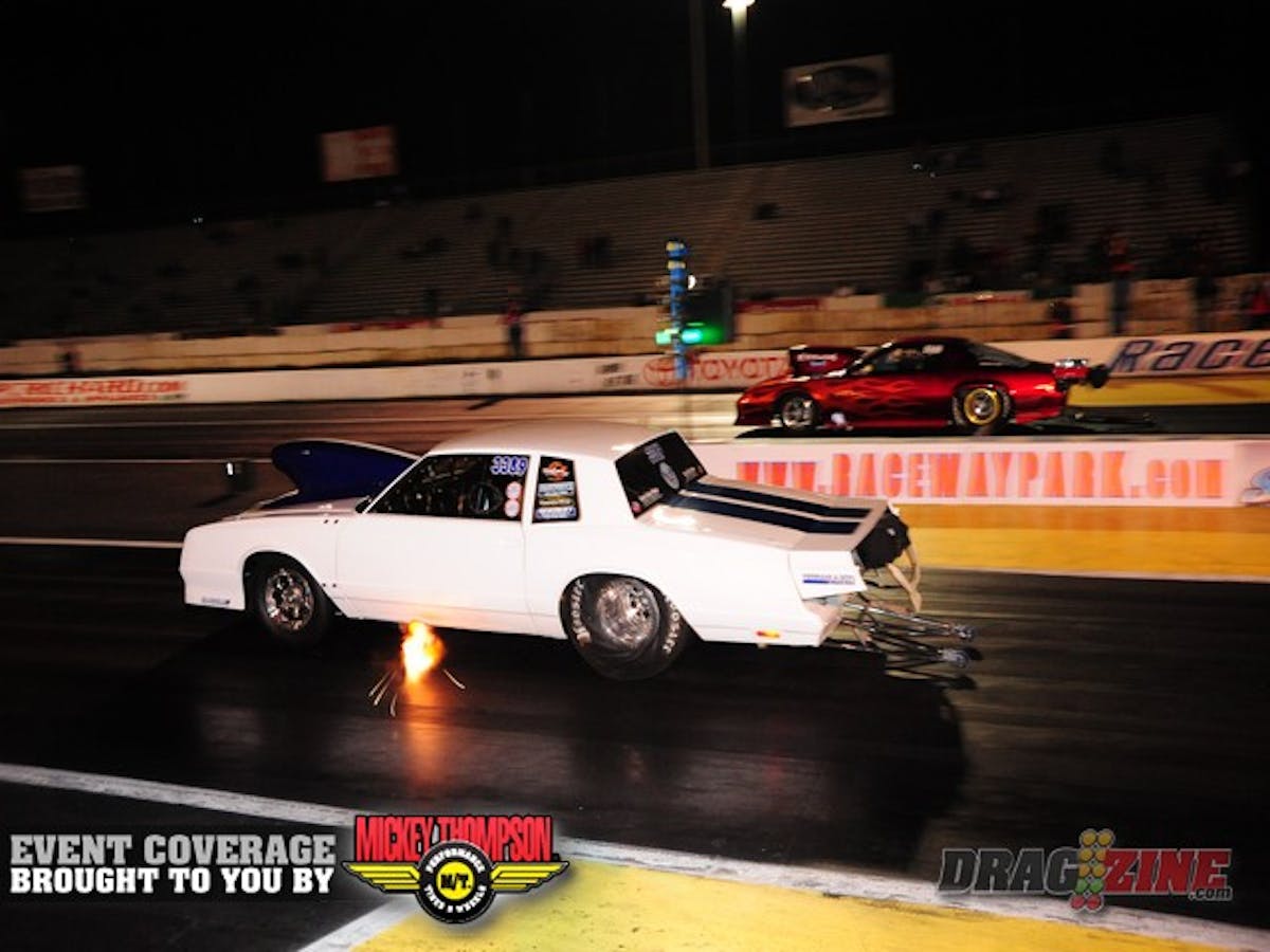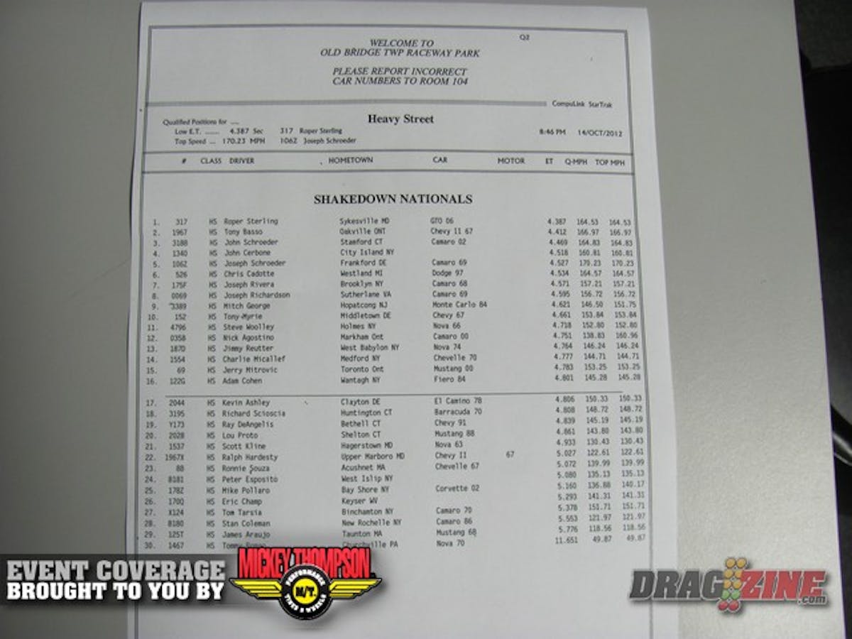 Mitch George used a stellar .002 reaction time in his semi-final run against John Cerbone to earn his way to the Heavy Street final. He flame-belching Monte Carlo held on for the holeshot win over the Camaro. George and Bruder both had shots to defend their 2011 Shakedown titles, but the money was split in several classes due to the late hour and Sunday 7:30 pm curfew.