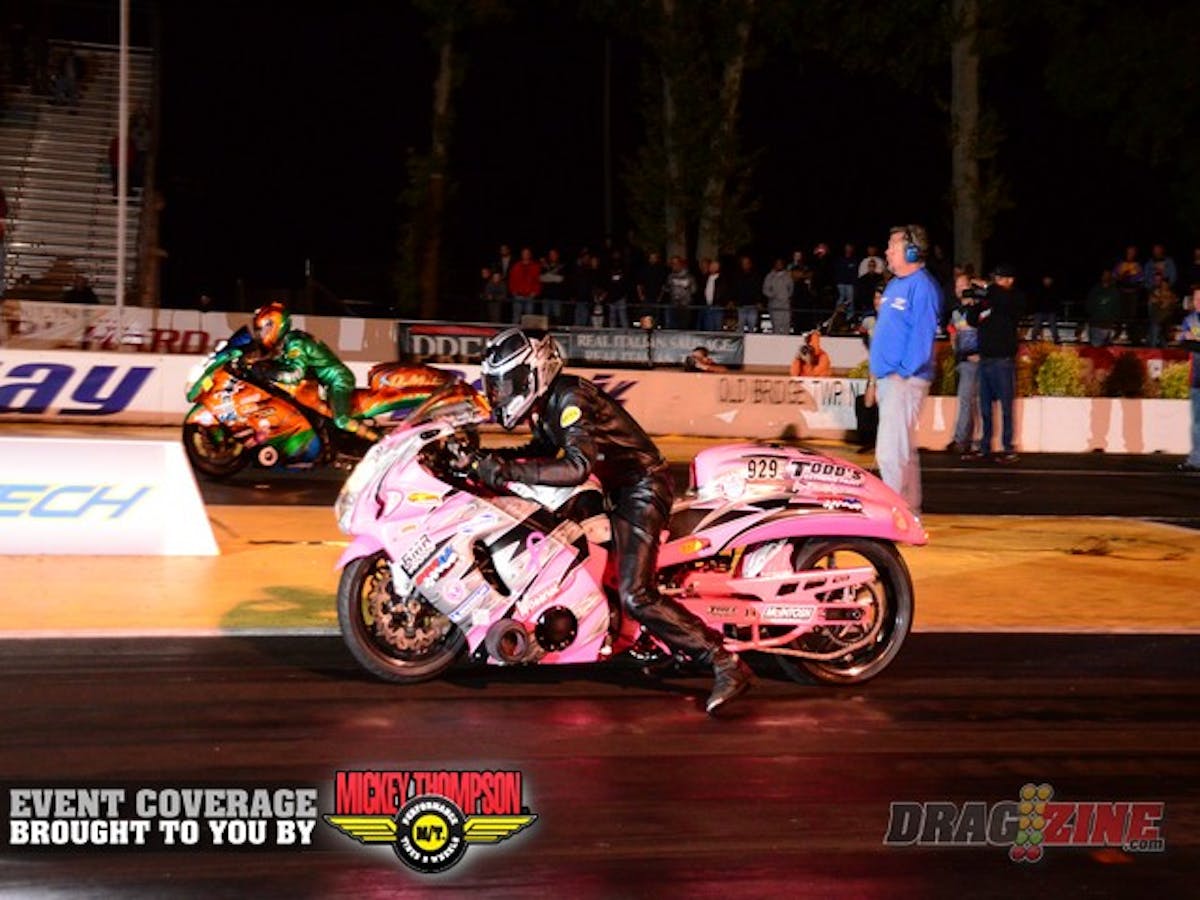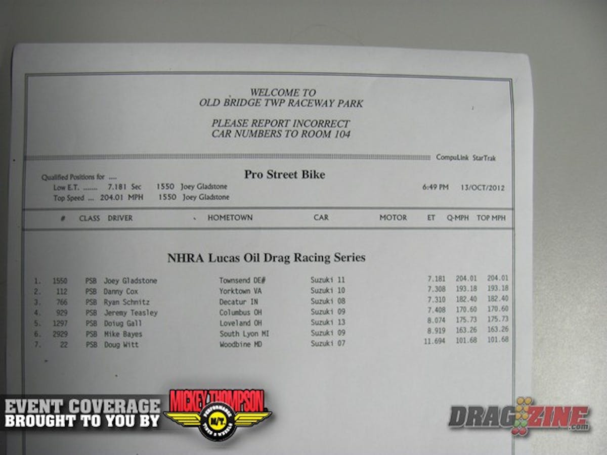 Pro Street Bike final- Jeremy Teasley defeated Joey Gladstone with 6.970/212.66. Gladstone was close with a 7.141/211.06 pass.