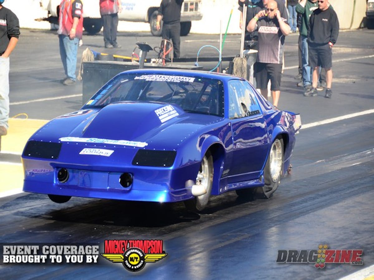 Joe Newsham is #10 in his Sicklerville, NJ based 92 Camaro in Outlaw 10.5 at 4.29/185. Newsham crashed heavily a few years ago with a turbo Mustang.