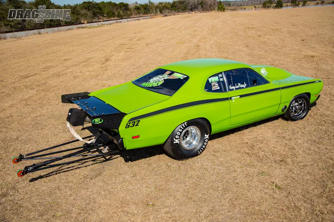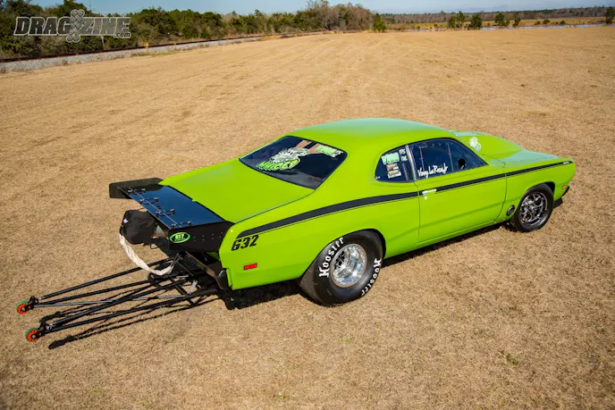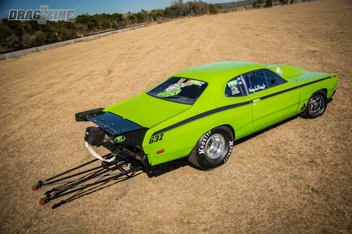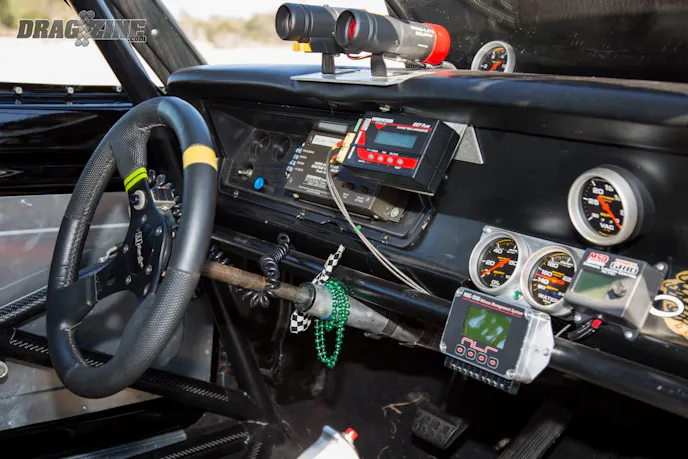 One of the cleanest cars on the property this weekend is Tony Ferguson's 56 Chevy 150 sedan running in 235 Limited. The car started as a body only field find taking about four years to get finished up for racing duty with the flawless paint and body done by Tony's cousin back in Wisconsin and the rest of the build done by Tony who had some help installing the roll cage. His 5.67 in qualifying last night is a new best for the car. He runs a509 big Chevy topped with a Cross Hair plate set up by Steve Johnson Induction Solutions in Spring Hill, Florida. The Ferguson's race together with his wife Jessica and their children here this weekend. From left to right, Tony, Riley, Isaiah and Jessica Ferguson.