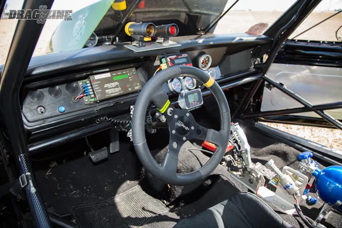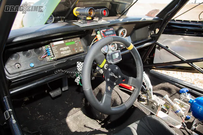 This clean 64 Chevelle runs in Outlaw 8.5 and is owned by Casey Van Tol out of Orland, California and one of seven brothers, all of whom own cars and race. The family is in the dairy business and is second generation from Holland. The car is all steel with a full interior with a fiberglass hood and is running in Procharger 235 Limited. The engine is a big Chevy from AES in Chicago topped with Induction Solutions nitrous. The paint and body was done by Eric Baron from Romona Body Shop. The car rides on Mickey Thompson tires, Weld wheels and stopping power from Wilwood. Melanie Salemi was off pace in qualifying with an electronics issue messing up the fuel curve on the engine. Melanie’s husband and tuner John Salemi says he has it figured out this morning and will be looking to run in the 5.80’s today in round two of Precision Turbo Pro Mod eliminations.