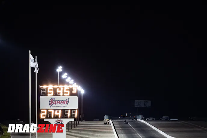 Let’s start off with the moonshot of the day. In the Pro Mod Shootout this evening, Eric Dillard–who stopped the clocks with a 5.700 pass in Outlaw Pro Mod qualifying–was driving the Q80 Racing Team’s Mustang. In the last pairing of the shootout, he was set to face off against John Stanley, who had cranked off his own personal best 5.579 at 263 mph blast earlier in the day in Stanley & Weiss Caddy CTS-V. Burnouts commenced, and after the pair backed up, crew chief Camp Stanley waved the Caddy off, setting Dillard up for a single pass. Dillard, perhaps sensing the big moment to come, quickly took the tree. The car rocketed out of the hole, stopping the quarter-mile clock with an insane 5.453 at 274.11 mph to set the tone for the weekend.