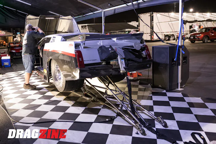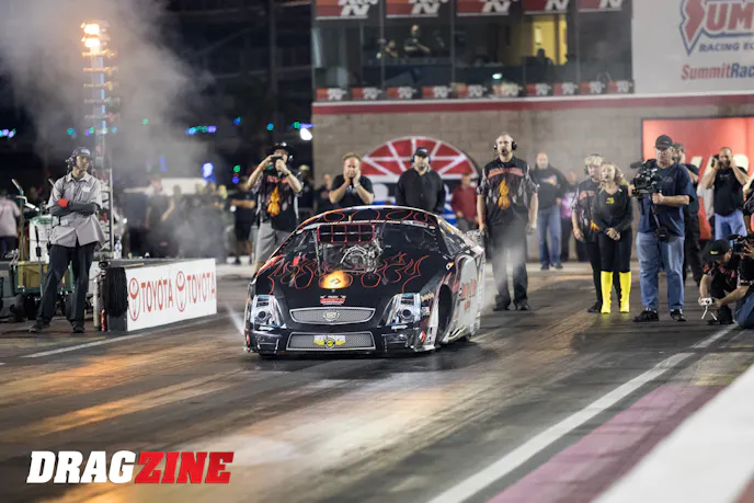 Rumor has it that the Stanley&Weiss Cadillac CTS-V driven by John Stanley and owned by his father, crew chief and legendary Pro Mod pioneer Camp Stanley, may be retired after this event. I spoke with Camp this afternoon and he explained that he’s tired, simply tired, after a decades-long career chasing the big prize around the country, as a driver, tuner, and car owner. If that does in fact turn out to be the case, the team will go out as one of the quickest Pro Mod teams around, as Stanley has turned in a personal-best 5.57. That’s good for second currently behind Eric Dillard’s monster 5.45 hit from last night. John Stanley is a seasoned driver who is incredibly capable behind the wheel, and I wouldn’t be surprised in the least to see him end up in the final round versus Dillard.