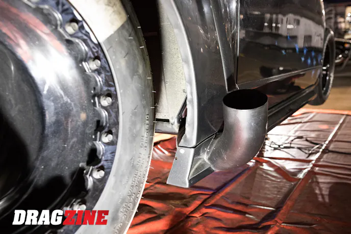The Giuseppe Gentile-driven, Robert Remillard-owned Evolution Racing Team Mustang was extremely nose-heavy, with 59 percent of the weight on the nose of the car, and they fought it at every turn trying to get the chassis to perform. After consultation, the team realized that the bullhorns at the front of the car were putting even more downforce on the nose and preventing the car from getting up on the tire. A conversation between the team and Josh Deeds of Deeds Performance led them to try something new: Deeds routed the downpipes from each of the 102 mm turbochargers along the framerails underneath each door and out the rocker panel just in front of the rear tire.