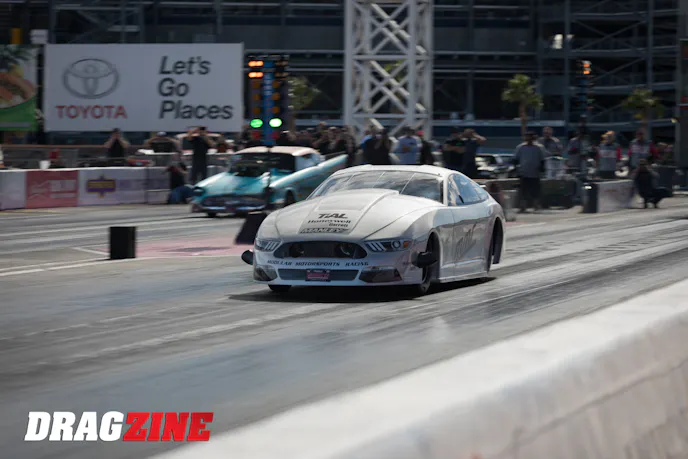 Back in 2014, we featured Eddy Whipple’s Nova here on Dragzine, but he’s moved into a new car–this beautiful Outlaw 10.5 Mustang packing 427 cubic inches of twin-turbo Ford power. Moments before this photo was taken, I was chatting with Eddy in the staging lanes when Greg Seth-Hunter’s crew chief, Mark Luton, came over to inform Eddy that they’d be switching lanes for competition. Eddy, who only has a few runs on this car so far, took the change in stride, switching to the left lane. He wasn’t expecting to win as they are still shaking the car down, but Seth-Hunter’s decision came back to bite him as the MMR Mustang got wildly out of shape in the right lane, which allowed Whipple to sneak around him for the win to move on to Sunday’s program.