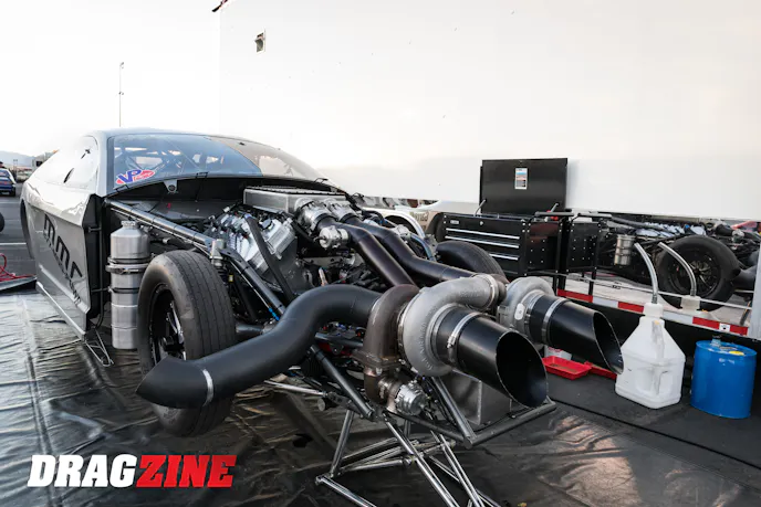 Tschiggfrie, in conjunction with Dick Maskin of Dart, developed a 5.300-inch bore space big-block Chevy that has full water jackets in it for cooling and is pumped up by a pair of Precision 98 mm Pro Mod Gen II turbochargers. This thing is such a street car that Tecklenburg had to remind them to drain the antifreeze out of it before coming to the race.
