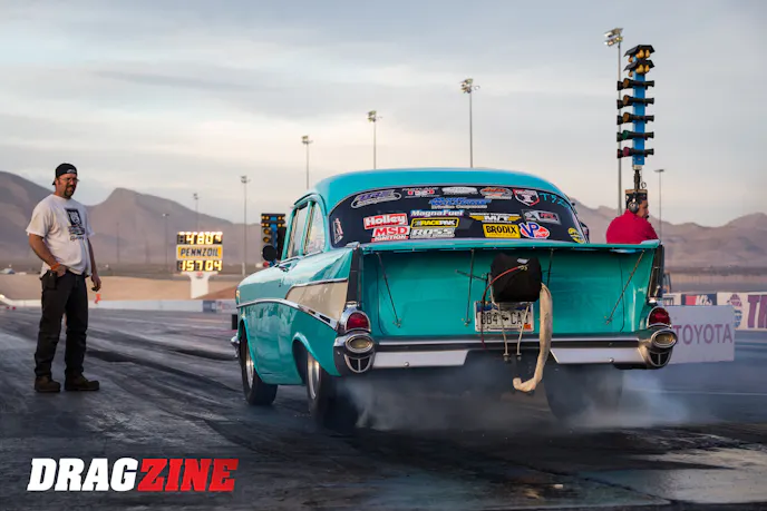 Matt Paris made the long trek over the hill from Longmont, Colorado with his pretty ’57 Chevy to run in the XDR class. It features a 565 cubic-inch with Big Duke heads and one of Fast Lane’s nitrous systems. This is their first time on radials and they’ve turned in a personal best of 5.02 at 140 mph. The 3,550-pound car normally runs in around 8,500 Density Altitude compared to the 2,500 or so we’re seeing here, so Matt’s sneaking up on the tuneup with baby steps.