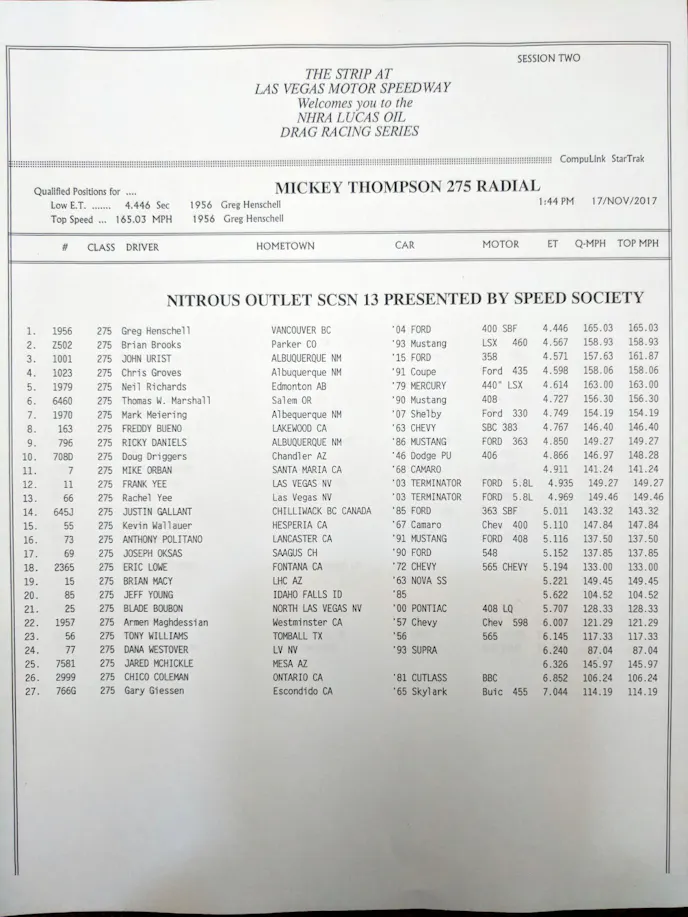 I met Canadian racer Greg Henschell for the first time today. The 2016 275 Radial class winner, who took home the title last year with a best pass of 4.48, made lots of little changes that have led to a substantial performance increase. Henschell goes into eliminations in the top spot with an outstanding personal-best 4.41 at 167.51 mph, which is the West Coast 275 record and nearly a tenth better than Chris Groves. The car runs a Bennett Racing Engines 400X engine topped off by a set of cast D3 cylinder heads.