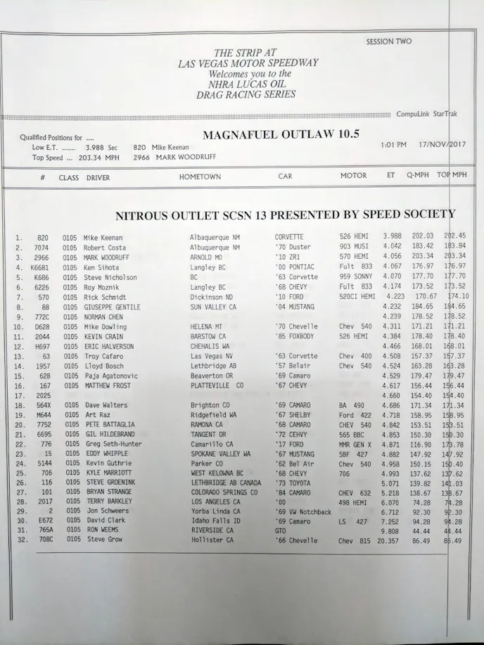 He may be 23 hours from home, but longtime radial racer Mark Woodruff wouldn’t be here if he didn’t think there was a chance to run at the top of the Outlaw 10.5 class. It turns out his suspicions were correct, as he clipped off the highest speed of the weekend so far with a 203.34 mph blast and a 4.056 elapsed time to sit in third so far. But he’ll have his work cut out for him, as Mike Keenan leads the stout 32-car field with a 3.988 so far. Keenan and Woody are the only two racers to break the 200 mph mark here at LVMS so far. There is a strong contingent of Canadian racers in the mix as well, as Ken Sihota, Steve Nicholson, and Roy Moznik are all solidly in the hunt along with Robert Costa in the Musi-powered Duster. Sihota and Nicholson have both come out of Vegas with cash in the past, so the race is on to see who will take home the bacon at the end of the weekend.