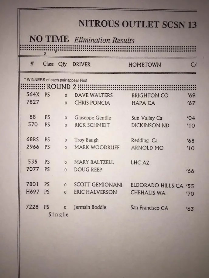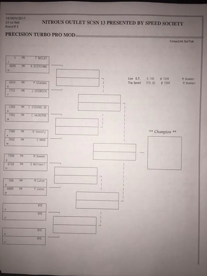 Mike Bowman is on a tear in his Pro Mod over the last little bit here. Not only did he outlast Carl Stevens in the final round, this marks his second SCSN win in a row. His winner’s circle photo is graced by Camp Stanley, who never met a celebration he didn’t like.
