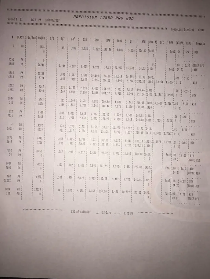“Without pedaling, it would have been a number-one qualifying pass based on the numbers we have. This twin-turbo stuff is new to me, and my driving style has to be altered. We’re still working on getting the tuneup squared away to get the starting line scenario figured out. We’ve got something for everybody in the class,” he said.