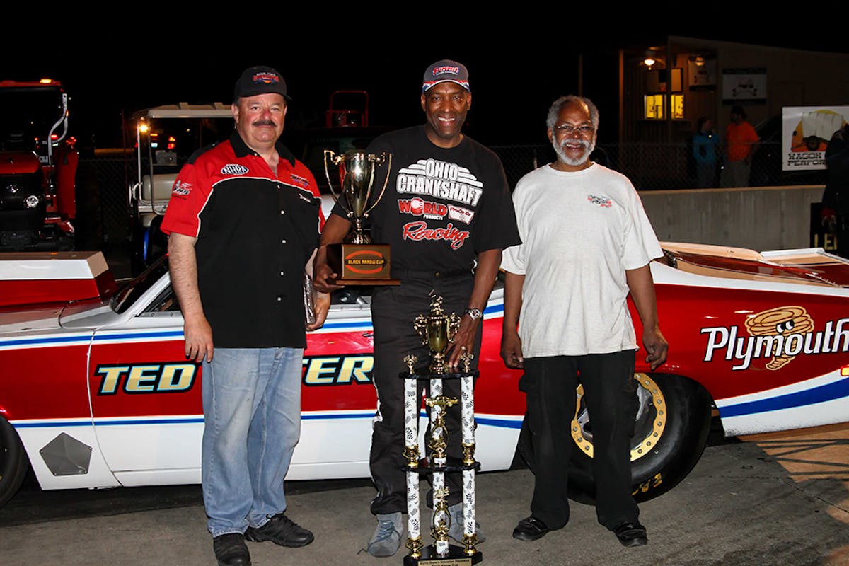 Markham, Illinois, Air Force veteran and technical wizard Ted Peters, (center), displays the spoils of victory with track owner Dominic Blasco, (left), and close friend/crewchief Fred Nunn, (right), who dominated midwest Pro Stock match race action in the early 1970s at the wheel of the “Tuff Rabbit” Camaro and Vega.
